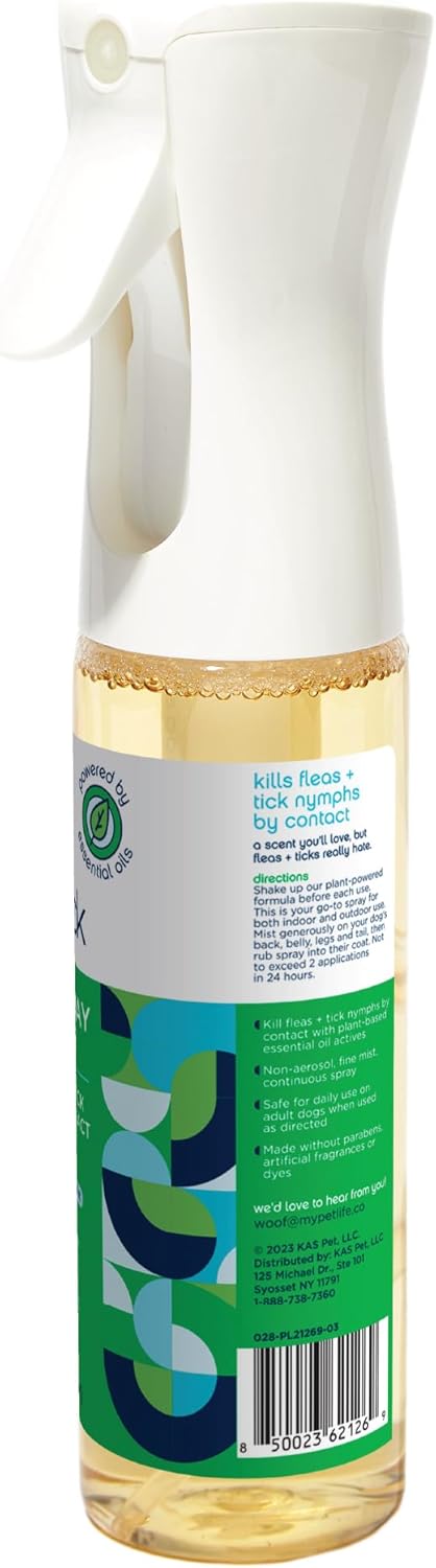 - DAILY FLEA SPRAY: Use our natural flea spray every day to kill fleas + tick nymphs by contact while hydrating your pup’s skin and coat. Our non-aerosol, continuous spray has plant-powered essential oils and a scent you’ll love but fleas + ticks just hate. Perfect for hikes and outdoor play dates.
