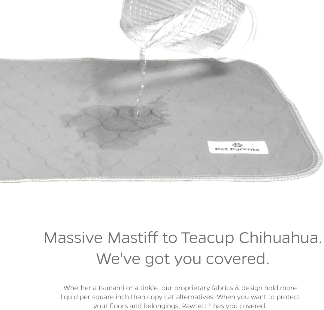 - BEST IN CLASS ABSORPTION & ODOR CONTROL – 2 pack (1 grey & 1 tan) of 18x24" premium puppy pads. Pet Parents Pawtect pee pads for dogs packs in the fluids, whether a great dane or chihuahua, we've got you covered. Our WickQuick proprietary fabric blend quickly wicks, absorbs & holds more liquids per square in than other options on the market. With this technology, our Pet Parents training pads for dogs provide anti-tracking & prevent your furbaby from tracking their mess throughout your home.