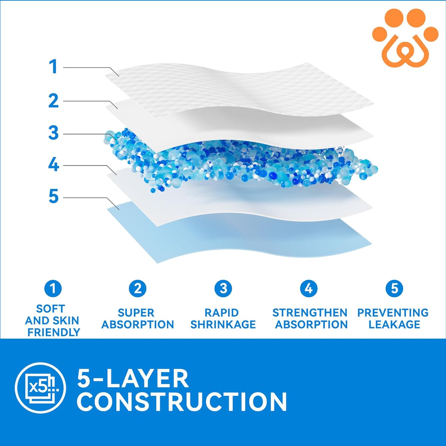 - 【Strong Absorbency, Keep Your Pet Dry】: JollyPaw pet training pads are designed with an innovative 5-layer structure that quickly absorbs liquids, locks in moisture, and ensures that the pee pads for dogs always stay dry. Its superior absorbency prevents liquid penetration, ensuring your home stays fresh and free of unpleasant odors