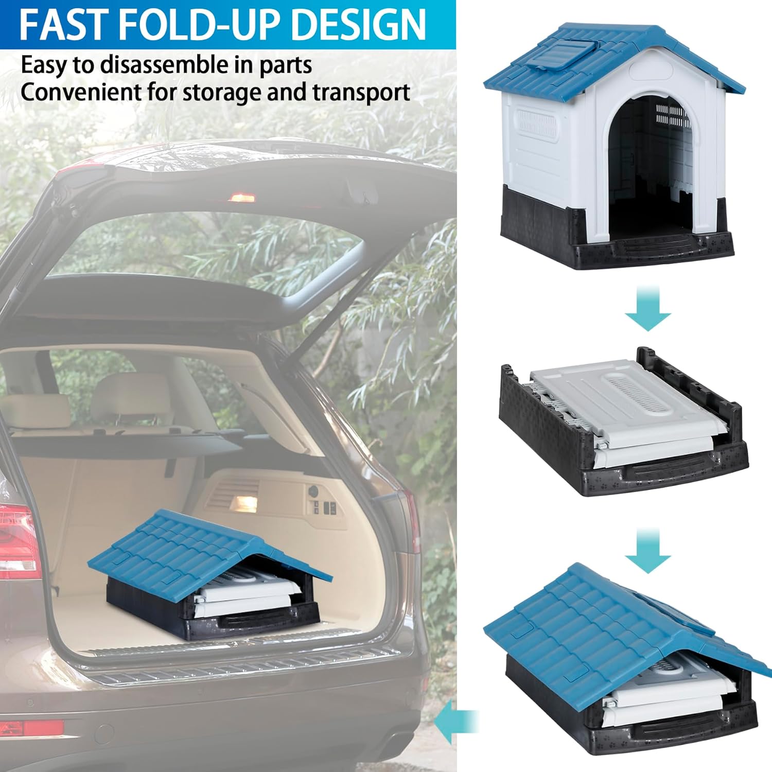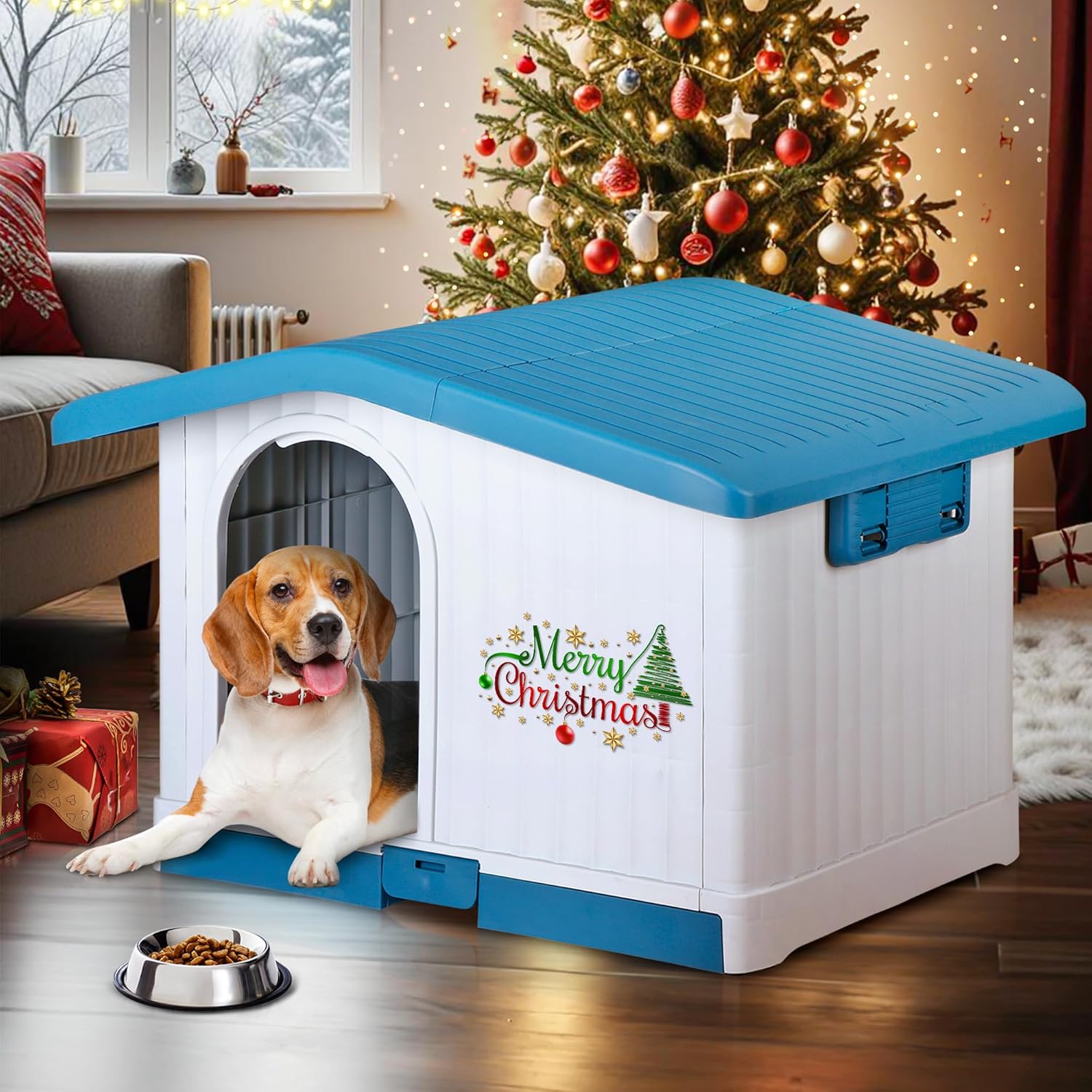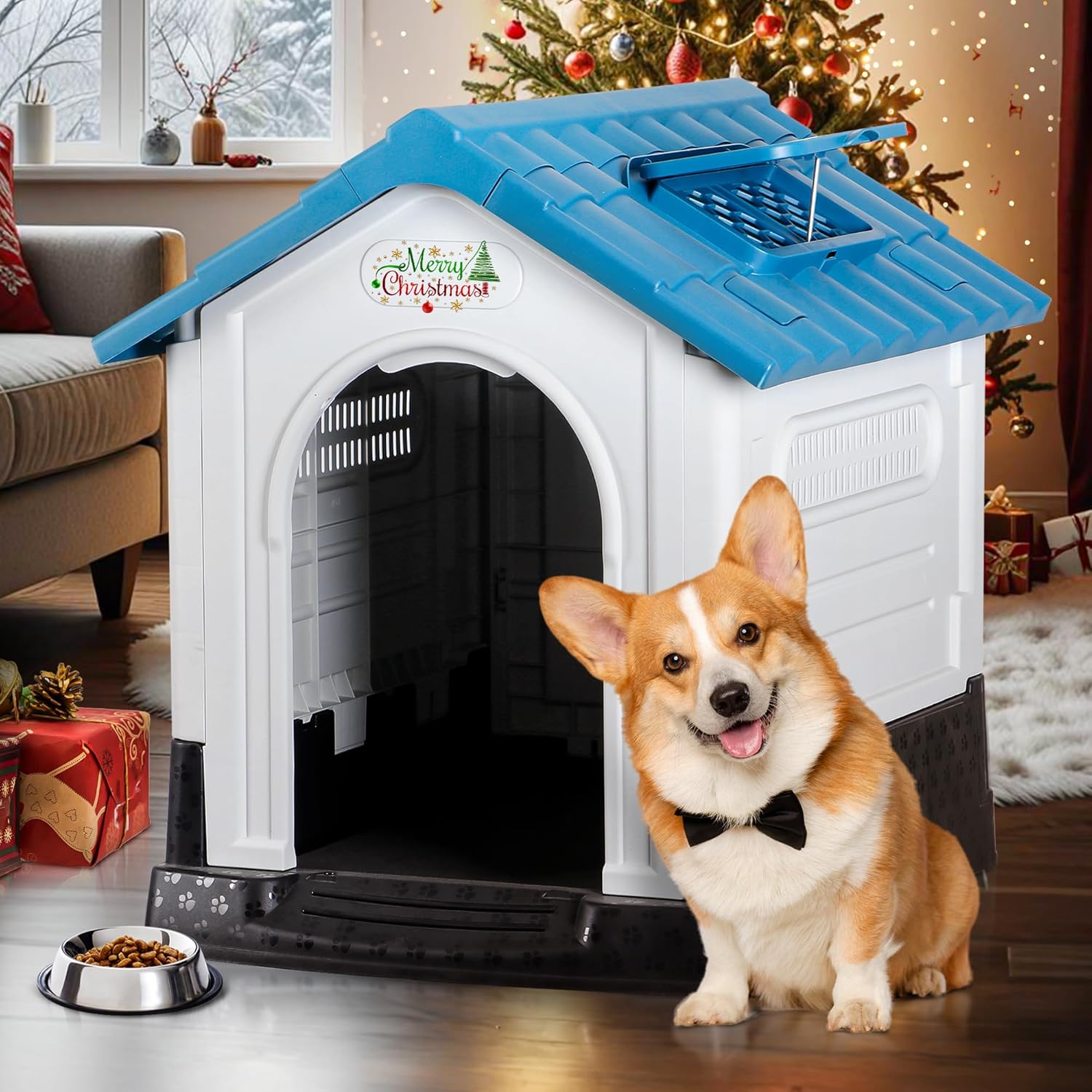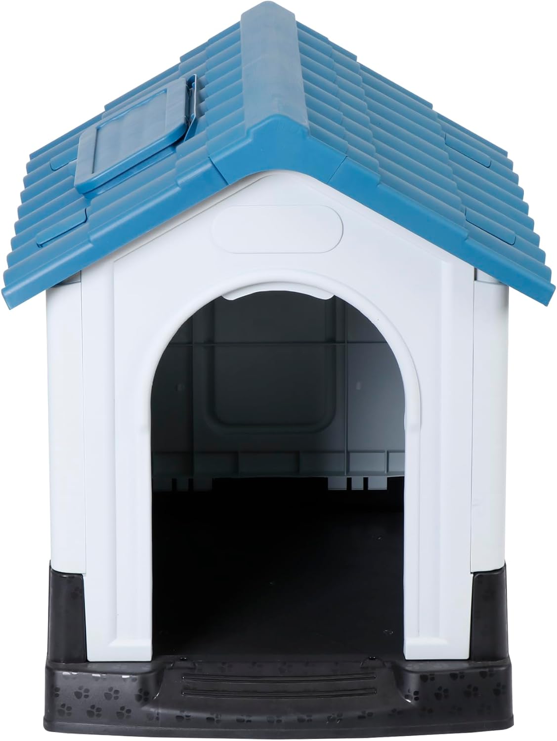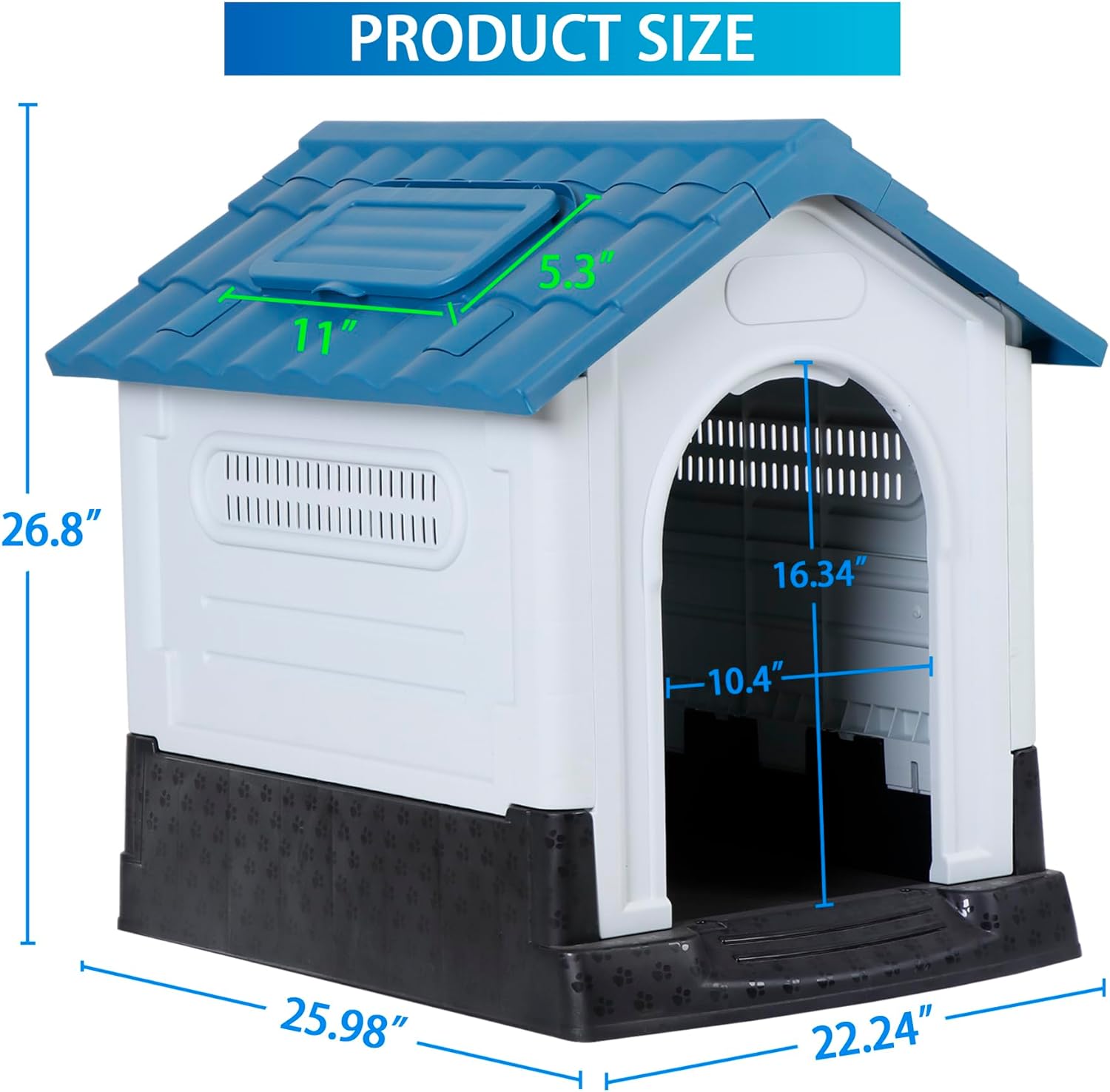 - Elevated Base and Large Space: The 2.55" higher floor design can prevent dirty water or rainwater flowing into the plastic dog house, protecting the lovely dog from dirt, rain, snow, providing a strong and warm shelter for your pets. The large dog house measures 22.24L x 26D x 26.8H inches is suitable for small and medium sized dogs. Entrance size is 26.34H x 10.4W inches