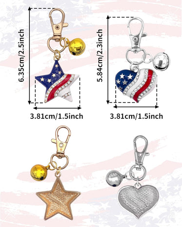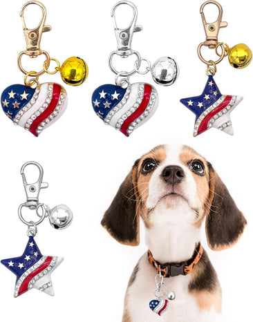 PET SHOW 4 Pack 4th of July Copper Bells for Small Dogs Cats Collar Charm Stars&Hearts American Flag Medium Large Dog Pet Pendant Accessories with Snap Clips Patriotic Rhinestone Keychain Bell