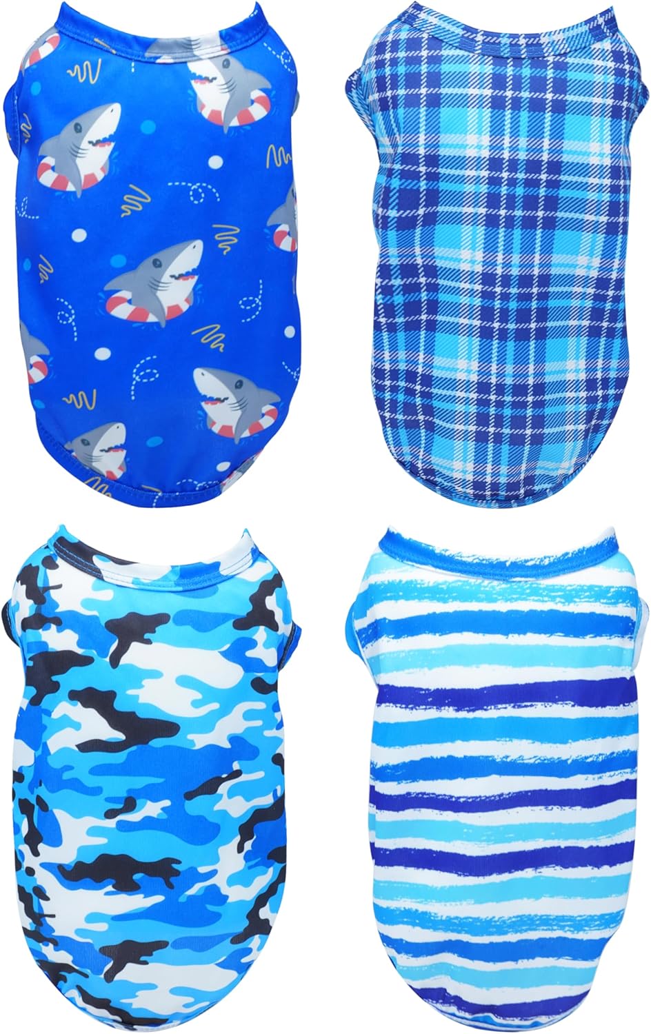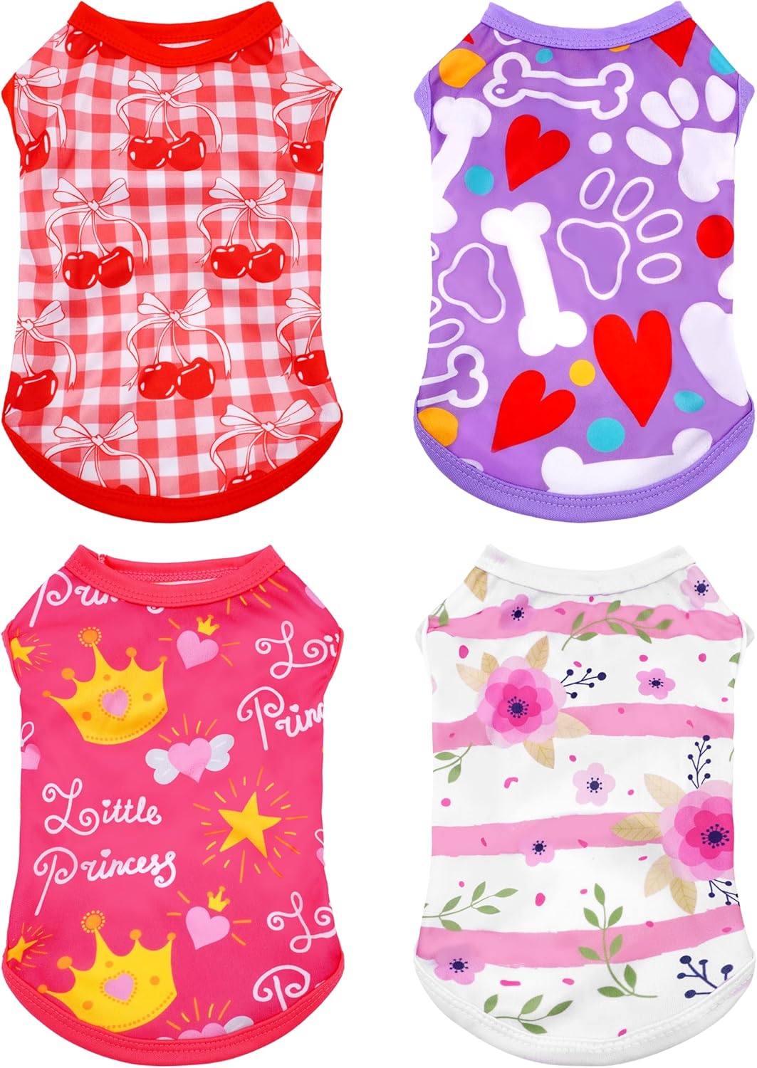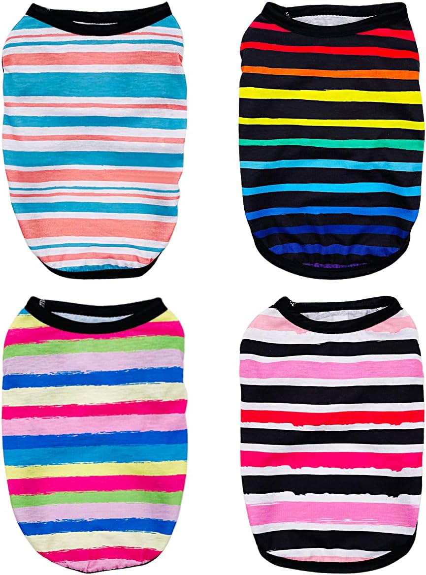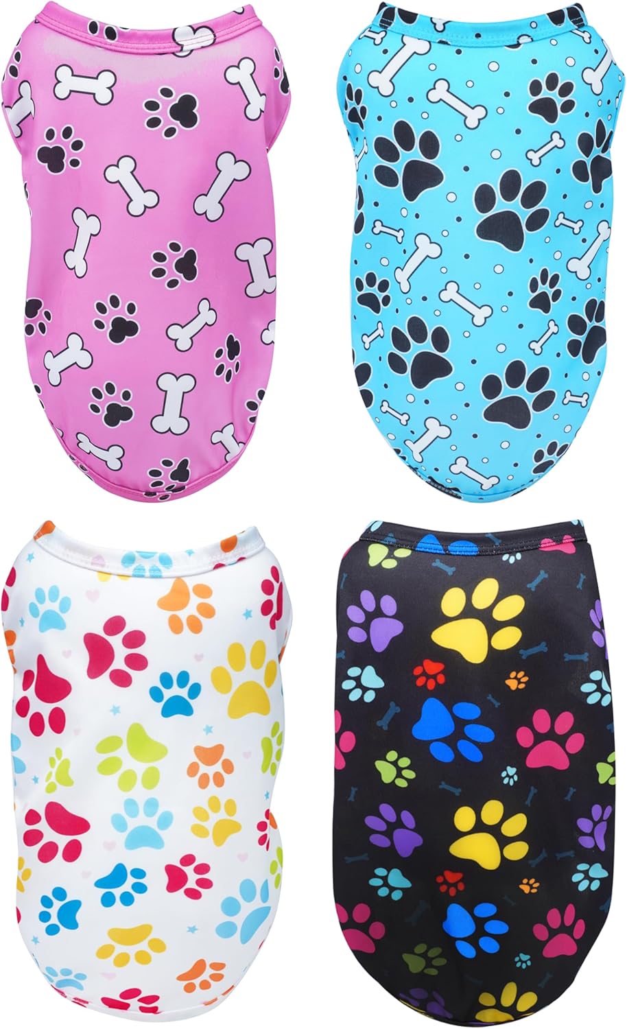 PET SHOW 4 Pack Paw Bone Printed Dog Clothes Soft Dog Shirts Vest Lightweight Sleeveless Cats Doggies T-Shirts Puppy Tank Top Tee Summer Cat Clothes for Small Medium Dogs White Black Pink Blue Material: Cotton blend & spandex, soft lightweight and breathable with some stretchy. Color: Four colors- white, black, pink and blue. Great for unisex cats and dogs- boys and girls. Design: 4 different unique design - paw and bone printed. Size: 5 sizes for adult cats, small medium dogs. XL AND XXL sizes don't fit any large breed dogs. If between size, size up. Please measure your pets' size to choose the exact size before ordering. --S: back length, 10"; chest, 14; neck, 10.5"; fits dog weight, 4.4-8.8 lb. --M: back length, 12"; chest, 16; neck, 12"; fits dog weight, 8.8-13 lb. --L: back length, 13.6"; chest, 18; neck, 13.6"; fits dog weight, 13 -19.8 lb. --XL: back length, 15.6"; chest, 20"; neck, 16"; fits dog weight, 19.8-24 lb. --XXL: back length, 17.5"; chest, 22"; neck, 16.4"; fits dog weight, 24-28.6 lb. Package: 4pcs small dog shirt clothes. Occasions: holidays, birthday party, daily walking, running and so on.