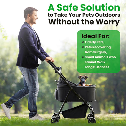 3-in-1 Pet Stroller 3-in-1 Pet Stroller: Comfort, Style & Functionality Give your furry friend the luxury they deserve with our 3-in-1 Pet Stroller – the ultimate combination of functionality, comfort, and style. Whether you're heading out for a stroll, a car ride, or simply need a cozy carrier for vet visits, this stroller covers it all. Versatile & Easy to Use Designed for pets up to 66 lbs , it easily converts between stroller, car seat, and carrier with no tools required. Breathable & Secure The breathable mesh canopy offers visibility and airflow, keeping your pet cool and secure on every journey. Lightweight & Durable Built with a sturdy yet lightweight aluminum frame, it folds flat for easy storage and travel. Safe & Smooth Maneuvering Enjoy smooth and safe rides with 360° front swivel wheels and a rear brake system for added control. Convenient for You & Your Pet Comes with a cup holder and undercarriage basket to carry treats, leashes, or your own essentials—everything you need on the go. Perfect for Any Lifestyle Whether you're a city dweller or a weekend adventurer, this pet stroller ensures every trip is safe, convenient, and comfortable—for both you and your beloved pet. Make Every Walk a Joyful Journey Let your pet ride in comfort and turn every walk into a joyful experience with our premium 3-in-1 Pet Stroller.
