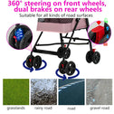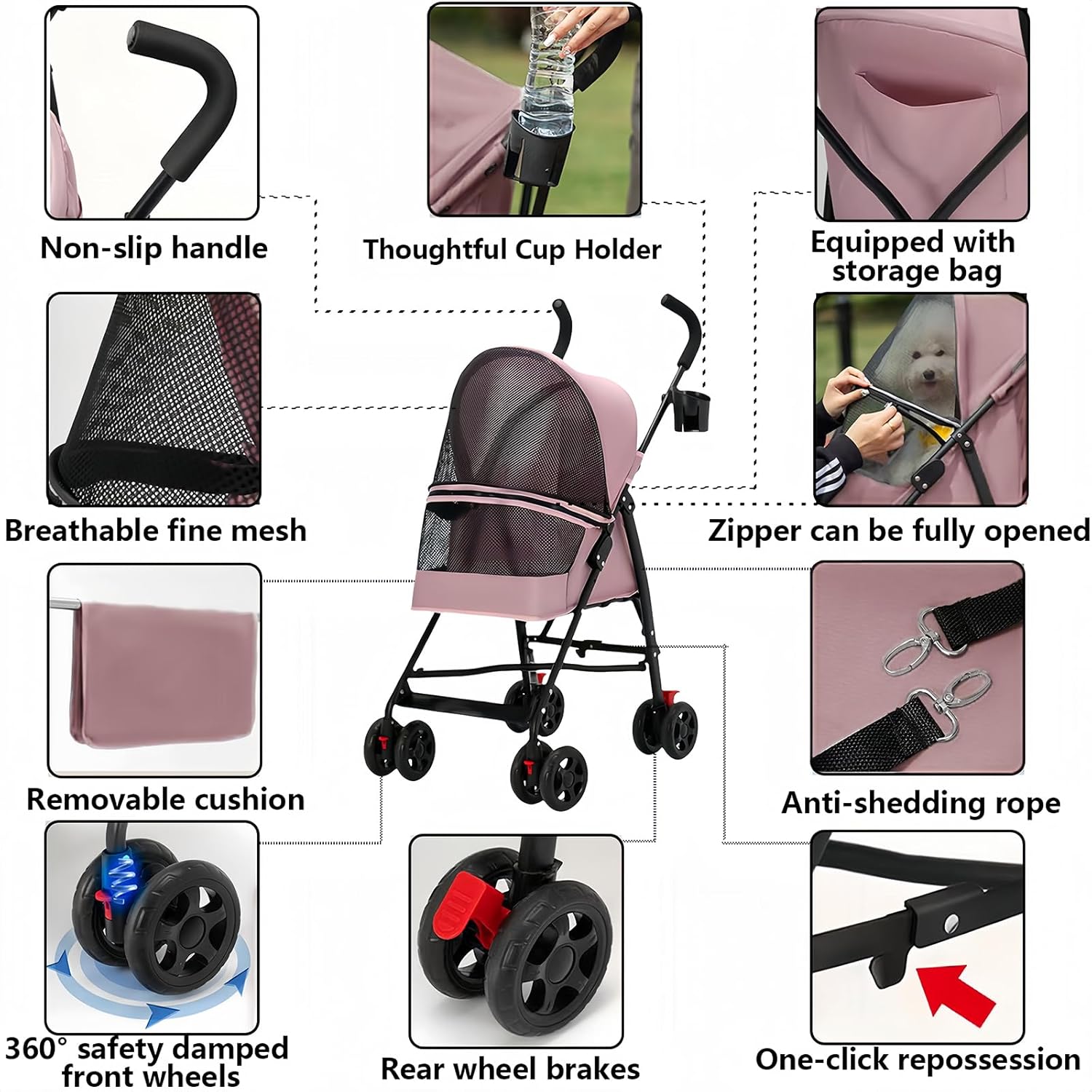 - FLEXIBLE WHEELS:The front wheels of this dog carriers for small dogs can swivel 360° with built-in springs to minimize bumps. The rear wheels are equipped with brakes to prevent the pet stroller from sliding, perfect for injured dogs, senior dogs or puppies in need of care