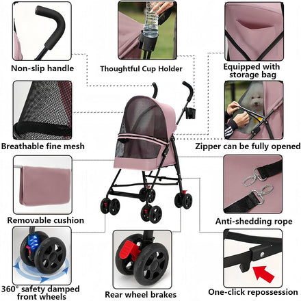 - STORAGE BAG AND CUP HOLDER:This puppy stroller comes with a storage pocket and cup holder for pet food and cups, easing the burden of carrying cups or pet food on the go