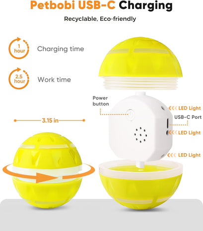 WELCOME TO PETBOBI! This boredom-breaking interactive dog toy comes with a built-in 500mAh rechargeable battery. When the rolling ball starts flashing red, please charge it immediately. The toy flashes at intervals as it moves, attracting your pet to play. Perfect for indoor fun — ideal for dodge ball, kicking activities. WHY YOUR DOG WILL LOVE IT Be your pet’s best companion when they are alone Help train your dog’s fitness and agility Reduce the risk of furniture or other items being bitten FUNNY DOG ACTIVITY TOY ADVANTAGES Durable and USB rechargeable Long-lasting and convenient to use Flashing LED light Automatic rolling and vibration Trust us, your pets will love it! TIPS 1. This moving dog toy is suitable for small and medium dogs. Large dogs may be too strong and could damage it. 2. The white ball inside is a vibration motor only and should not be chewed. 3. Supervised play is recommended for better durability. 4. No toy is indestructible - Always supervise playtime to maximize toy lifespan and ensure safety 5. Not suitable for aggressive chewers TECHNICAL SPECS Color: Yellow Material: TPU Product Diameter : 3.15 in PACKAGE INCLUDED 1 × Active rolling ball 1 × USB cable 1 × Instruction manual Then what are you waiting for? Get one now — your furry friend deserves it!