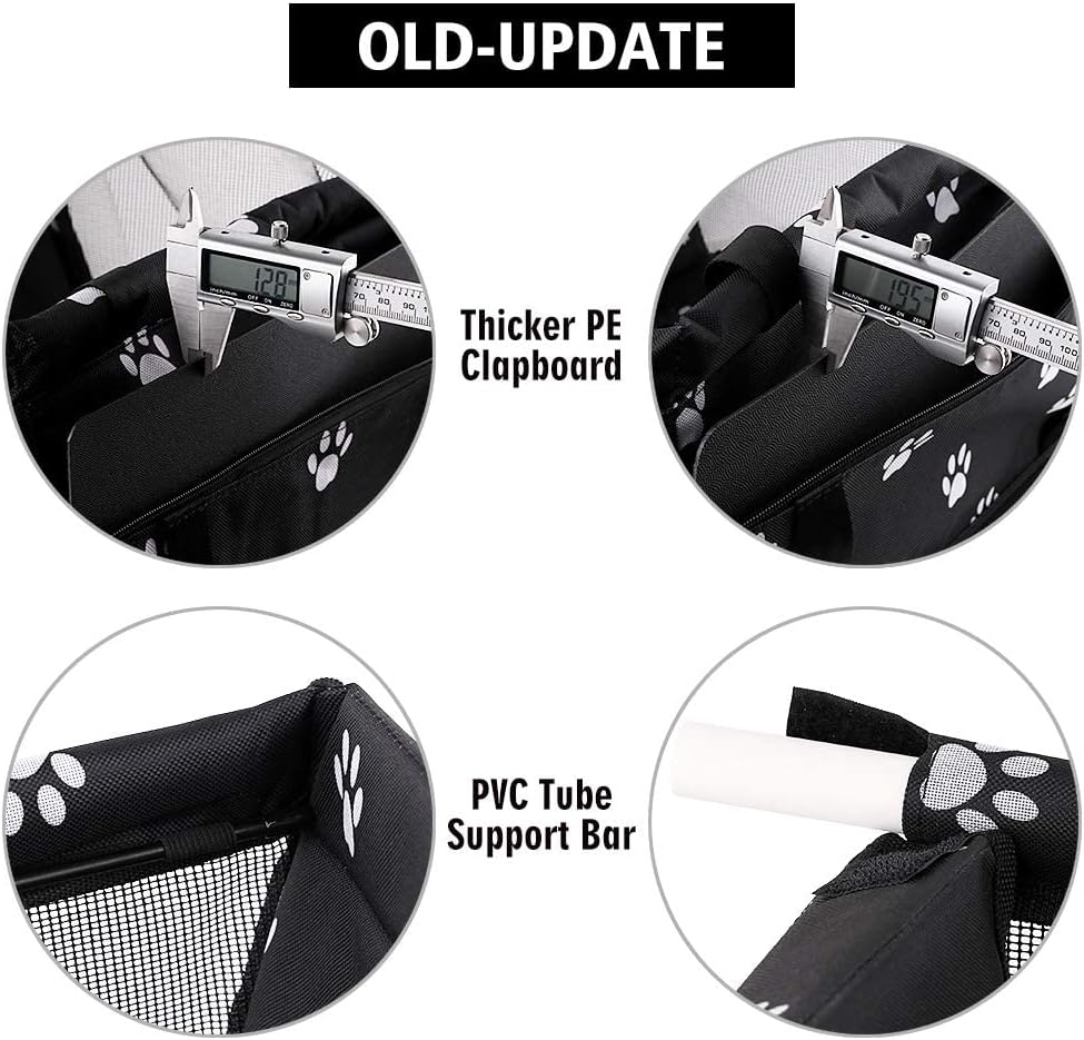 - Upgrade Reinforced Version: Petbobi paw print dog car seat's back,bottom and front with thicker Pe Clapboard than before,and the bag edge fill up with thick foam bar. Seat back add a strap to make seat can’t move ( Safer ). and other two sturdy Pvc tube (more stable) increase the edge of the support force. These make our Pet car seat more sturdy and safe