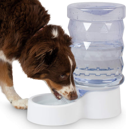 The PetFusion H2O Gravity Dog & Cat Waterer keeps your furry friend hydrated with less effort required on your part! The automatic gravity design replenishes your buddy's water supply keeping her thirst quenched throughout the day. When the level gets low, the water hopper automatically fills the water reservoir. There is also a removable cap on the bottle for your cleaning convenience. Gravity causes the water dispenser to consistently supply your pet with water. The ridge located on top of the water reservoir assists when refilling, opening the lid off the base. Crafted from durable, pet-safe BPA-free PP plastic and the reduced seams and water release areas help remove buildup in the lower basin. The water basin, lid and reservoir separate for hassle-free cleaning. Place the water basin and lid on the top rack of your dishwasher and hand wash the water bottle with soap and warm water. 100% recyclable.