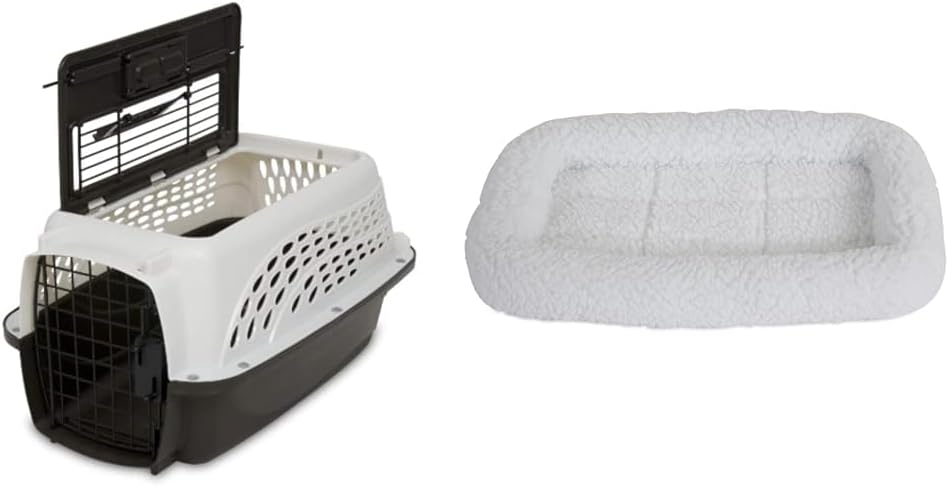 The Petmate Two-Door Dog and Cat Kennel is a reliable small pet carrier well-suited for travel with pets up to 15 pounds. This versatile pet carrier is ideal for both small dogs and cats, featuring top and front-loading doors for easy access and convenience. As an airline approved pet carrier, it fits most airline specifications. The dog car carrier design is excellent for car trips, with secure latches and a foldable handle that makes transport easy. Ventilation holes on all sides help your pet stay comfortable with fresh airflow and full visibility; minimizing travel anxiety whether you're using it as a dog travel crate or cat kennel. Cleaning is hassle-free with its sturdy plastic shell, and the interior stay-dry moat keeps your pet dry during travel. With dimensions of 24.0"" L x 14.5"" W x 17.0"" H, this small dog kennel provides adequate room for pets to move around comfortably. Its stable design supports your pet's natural denning instincts, providing them with a comforting, snug space to rest. The Petmate dog carriers for small dogs also serve as a great dog crate for car trips or visits to the vet, groomer, or park.