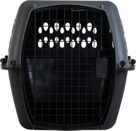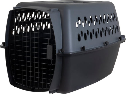 Introducing the Petmate Pet Porter Dog Kennel 26" - the perfect solution for pet owners who want to securely and safely protect their furry friends while traveling. This small dog crate is made of sturdy plastic with a durable wire door that can be easily opened and securely locked with an easy-open latch. The fold-down handle makes it easy to carry, even when you're on the go. This pet travel crate is suitable for pets up to 25 lbs, with exterior dimensions of 26" L x 18.6" W x 16.5" H and interior dimensions of 23.8" L x 17" W x 15.5" H, and weighing just 4 pounds so you can take it with you wherever you go. This airline-friendly dog carrier meets most airline cargo specifications and has ventilation on four sides to keep your pet cool and comfortable. It even includes built-in storage for additional pet identification. The Petmate Pet Porter Dog Kennel 19" is easy to assemble, with no tools required. It's also easy to keep clean, with a sturdy plastic shell that can be wiped down quickly and easily. The stay-dry moat that surrounds the interior pulls fluids away from your pet in case of wet accidents, making it a great puppy carrier or kennel trainer for housebreaking. At Petmate, we provide everyday essentials for pet parents, dogs, cats, and other pets. From litter box accessories to pet toys, cat cages, dog cages, gravity water/food bowls, pet beds, puppy crates, cat carriers, and more, we've got you covered. With the Petmate Pet Porter Dog Kennel 19", you can rest assured that your pet is safe and comfortable, whether you're traveling by car, plane, or any other mode of transportation. Give your pet the gift of comfort and security on the go!