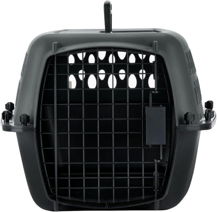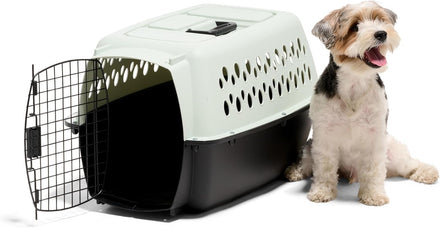 Introducing the Petmate Pet Porter Fashion Dog Kennel— the perfect solution for pet owners who want to securely and safely protect their furry friends while traveling. This dog crate is made of sturdy plastic with a durable wire door that can be easily opened and securely locked with an easy-open latch. The fold-down handle makes it easy to carry, even when you're on the go. It meets most airline cargo specifications and has ventilation on 4 sides to keep your pet cool and comfortable. It even includes built-in storage for additional pet identification. The Pet Porter assembles effortlessly with metal nuts and bolts—no tools required. It's also easy to keep clean, with a sturdy plastic shell that can be easily wiped down. The stay-dry moat surrounding the interior pulls fluids away from your pet in case of wet accidents, making it a great puppy carrier or kennel trainer for housebreaking. Made proudly in the USA from EcoTEC Plastic with 90% to 100% pre-consumer recycled material.