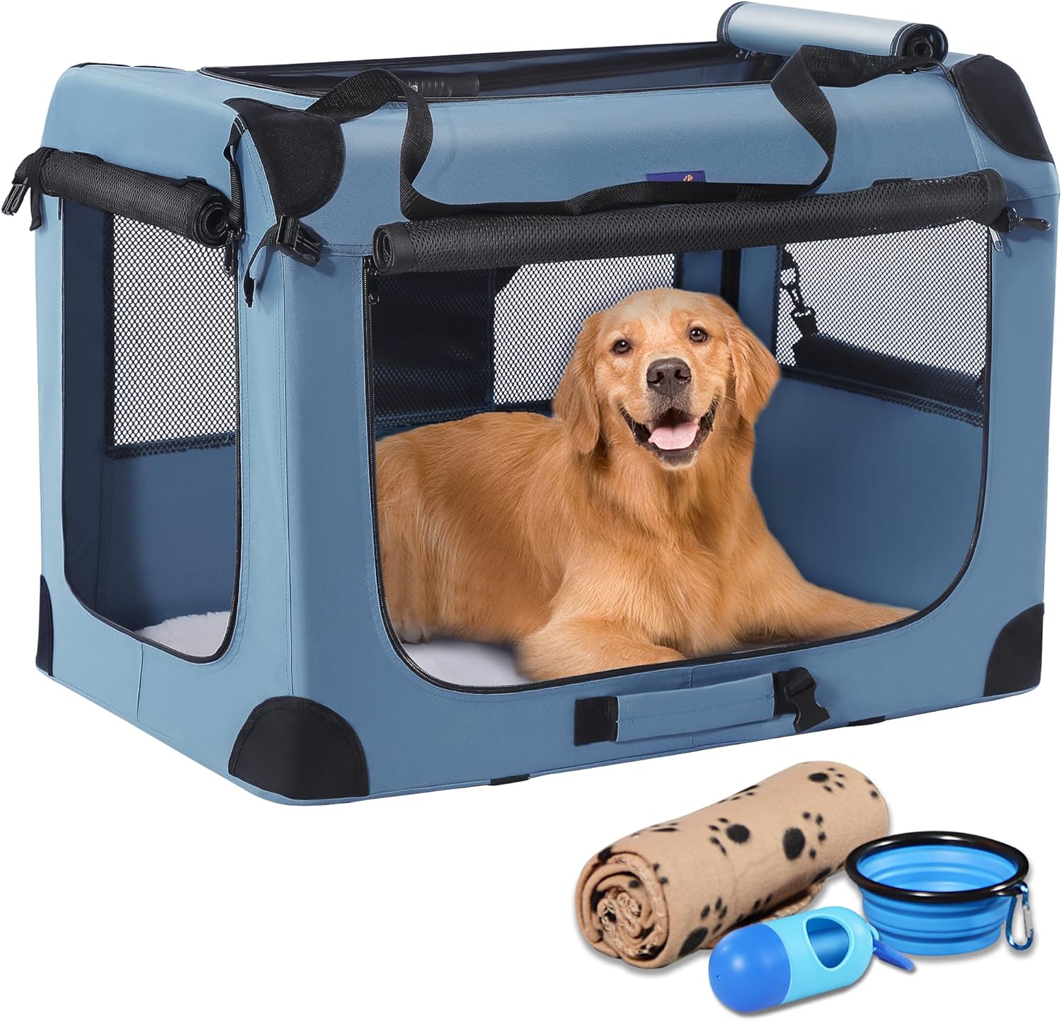 - 【Useful and thoughtful accessories】The collapsible dog crate is equipped with a plushy mat for extra comfort, which is removable & washable. What's more, there is one warm blanket and one foldable travel bowl, your lovely pet must fall in love with them.