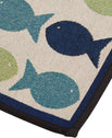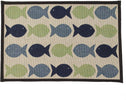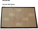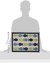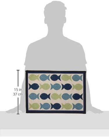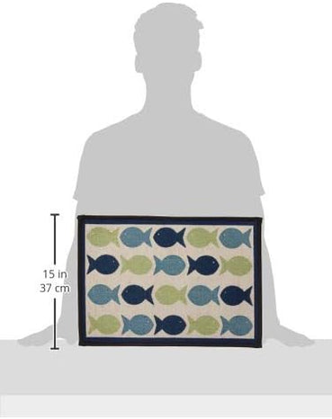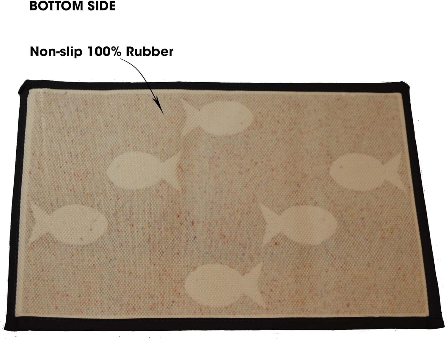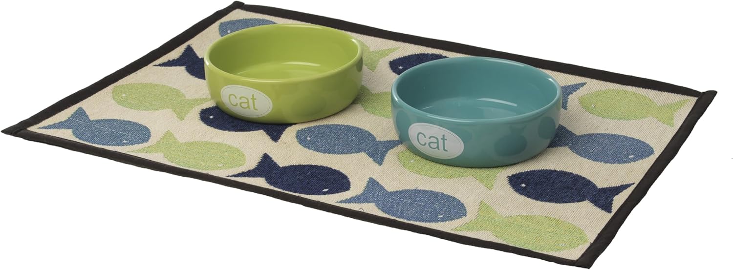 PetRageous Designs, Kool Fishes tapestry pet placemat is made of woven 65% cotton and 35% polyester. The underside is 100% rubber which has two great benefits for this cat or dog feeding mat. The rubber backing creates a non-skid, anti-slip surface with the floor. This limits movement while dogs or cats are feeding to help reduces messes. This rubber backing also creates a barrier that prevents liquid spills from reaching the floor. Additionally, the woven topside of the pet feeding mat helps block and contain spills. The topside of the tapestry mat helps pool and absorb water spills. PetRageous dog and cat placemats help organize the pet dining area and adds to your home and kitchen décor. Our pet feeding mats are machine washable. Lay flat to dry with rubber side facing up. This placemat is functional for all types of pets and is ideal for small dogs, medium dogs, large dogs and puppies. All PetRageous placemats feature a unique woven pattern or slogan to compliment the dog bowls or raised dog feeders placed on them. The pattern for this placemat is woven fish sillouttes in green and bluw throughout with a off-white background. Dimensions are 19 inches by 13 inches and is .112 inches thick.