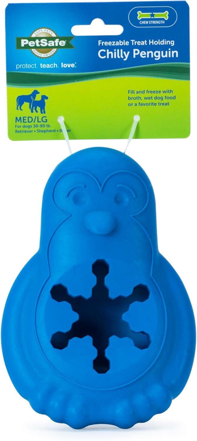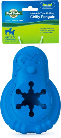 - FROZEN FUN: The PetSafe Chilly Penguin Freezable Treat Holding Toy holds your dog’s favorite frozen treats like flavored water, broth, peanut butter, yogurt or wet dog food