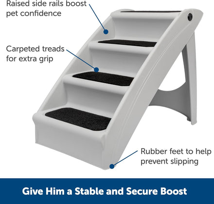 - Foldable Non-Slip Design: Safety tested for durability, these plastic steps feature non-skid feet, side rails and replaceable fabric tread covers to keep the stairs from moving and your puppy from sliding; Folds down flat for easy, compact storage