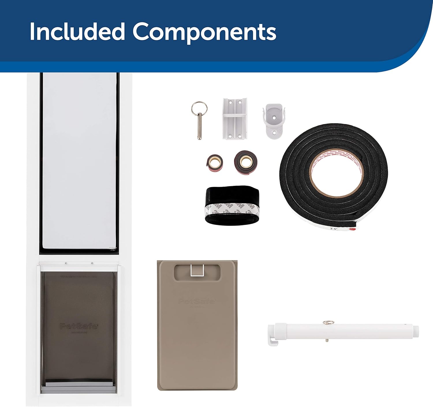 Closing Panel, T-brackets, Connecting Bars, Weather Stripping, Screws, Double Sided Adhesive Strips, Pet Door Panel Bottom, Glass Sweep, Security Bar Clip, Pet Door Panel Top, Security Bar, Security Bar Bracket |