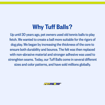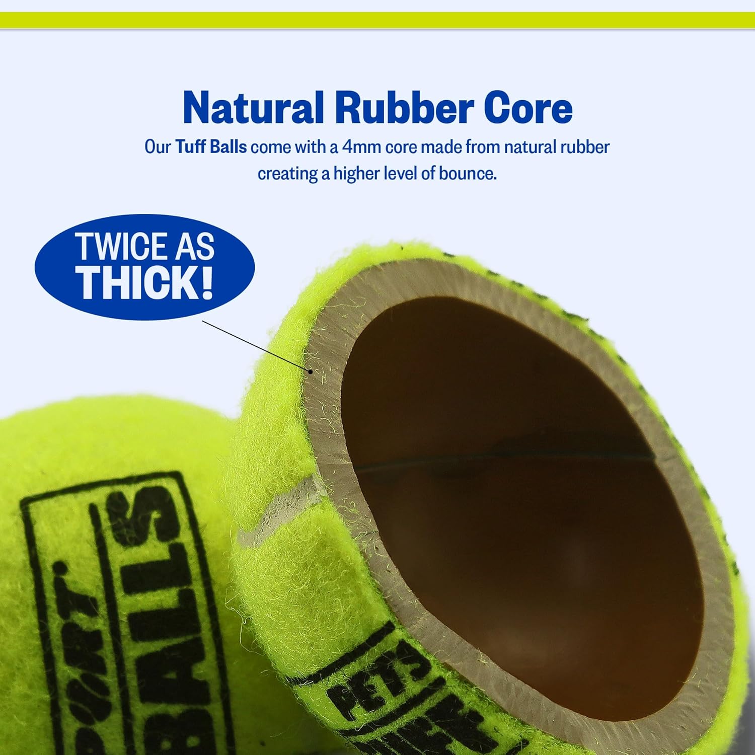 - EXTRA DURABILITY - Tuff Balls have extra-thick natural rubber walls which give added durability & bounce. Our tennis balls are made of non-abrasive polyester felt that won't wear down your dog's teeth