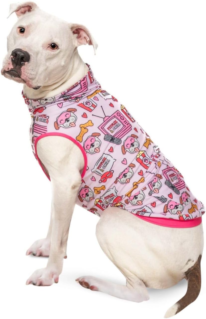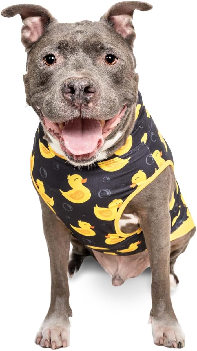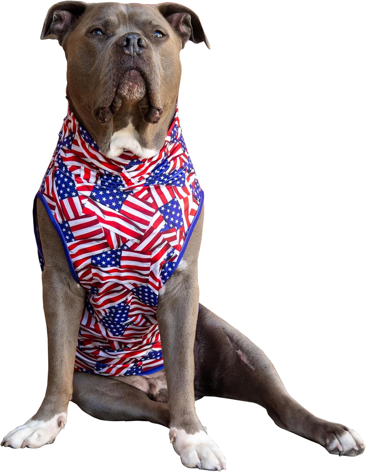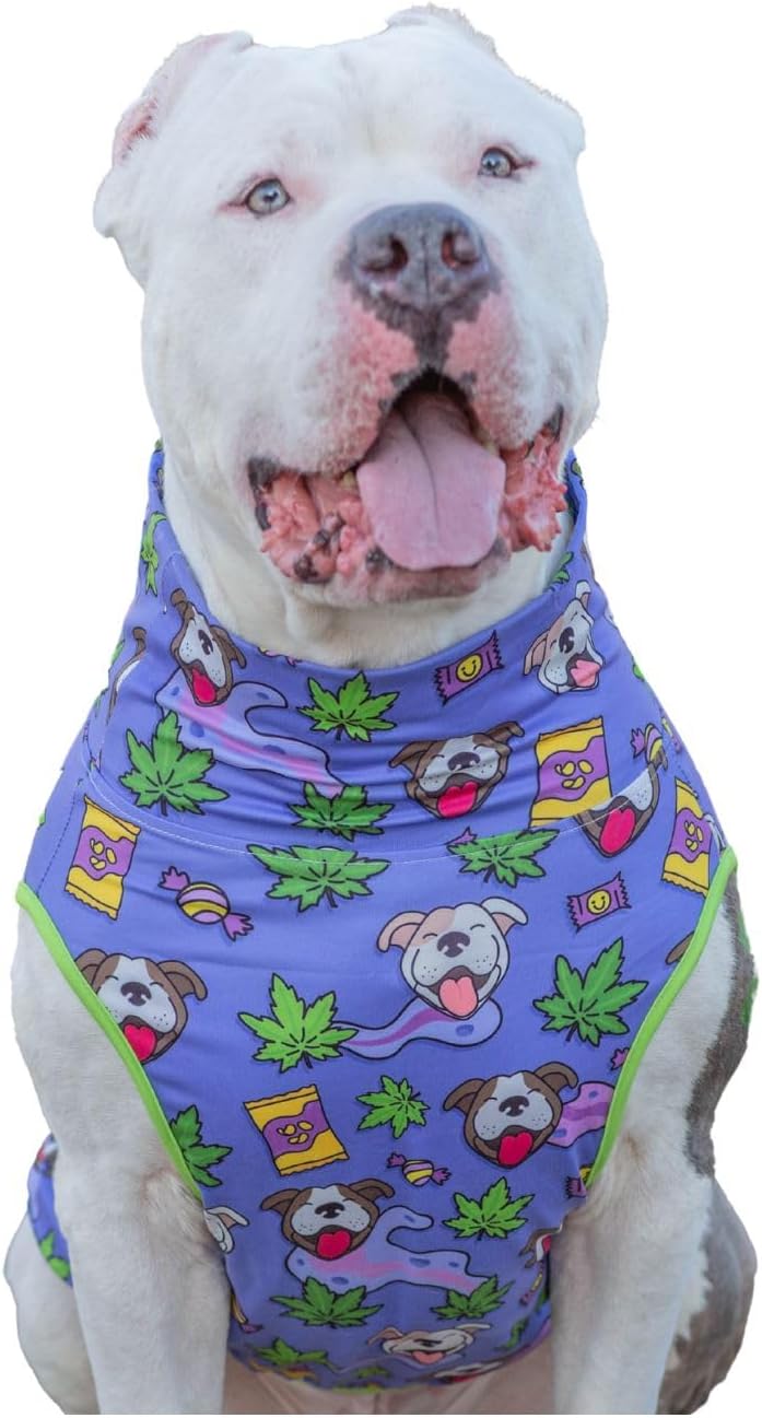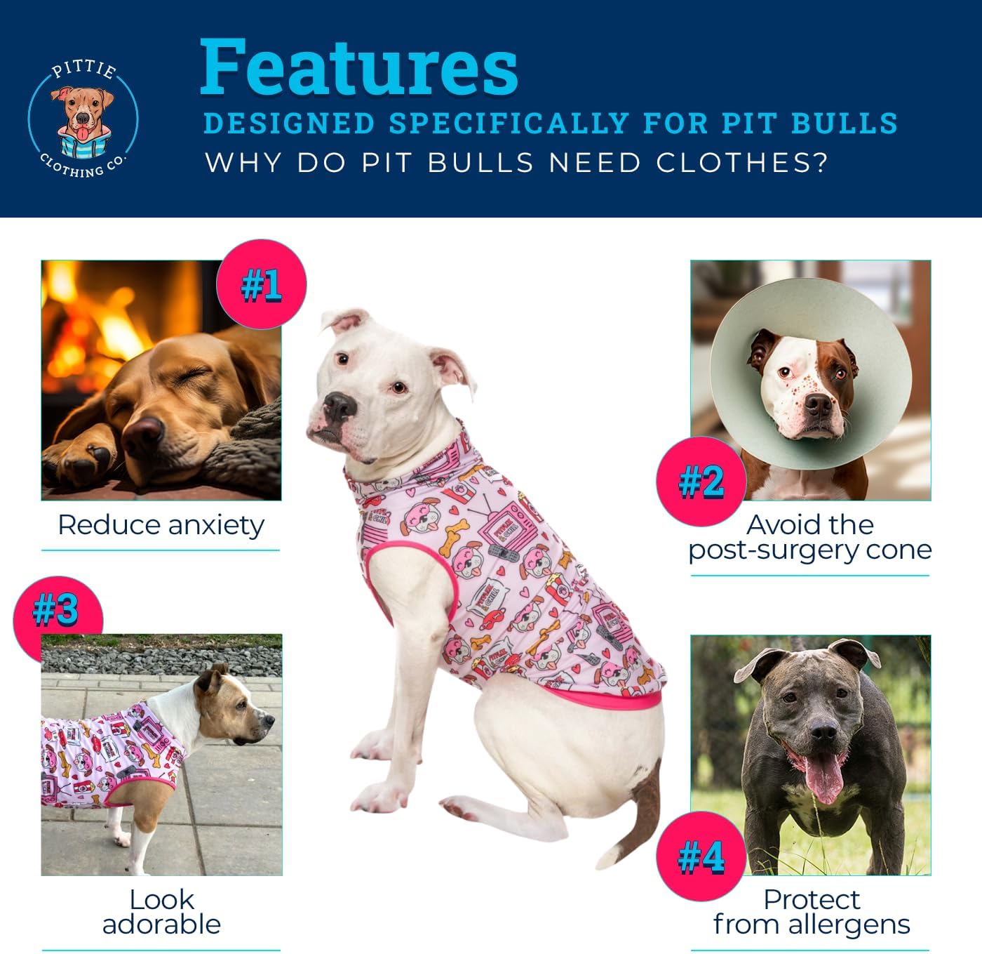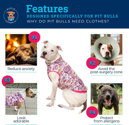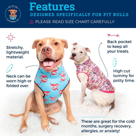 Welcome to the Pit Bull Club! -- Introducing our exclusive collection of pit bull muscle t-shirt for dogs. We 100% understand the unique needs of pitbulls. We have designed our t shirts to cater to dogs with larger chests and necks, while also ensuring a shorter body length for a perfect fit. Say goodbye to ill-fitting clothes and hello to superior comfort with our specially designed pit bull cooling muscle tees. Receive (1) Muscle Tee . Matching sets sold separately. **Please read size chart carefully** Adora-bull -- Not only do our pit bull t shirt vest prioritize comfort, but they also exude style and personality. We believe that your pitbull should showcase their individuality even while lounging around at home. That's why we offer a range of adorable and trendy designs to choose from. Whether it's cute prints, funny or fun prints or vibrant patterns, our dog cooling shirt allow your pitbull to stand out in the cutest way possible. The best pitbull accessories for dogs. Our large size high neck t shirts offer versatile uses that go beyond just a fun dog outfit -- They serve multiple purposes such as aiding in post-surgery recovery, providing relief for itchy skin, preventing short-term scratching, offering protection during the summer months, helping to reduce anxiety, and even working towards reducing breed stigma. These dog t shirt for pit bulls will make your dog feel good because they will look good! Treat your pitbull to the ultimate level of comfort with our cozy and stylish pet t shirts. Our dog shirts for large breed are stretchy, lightweight material, neck can be worn high or folded, and even have a high cut tummy for potty time. Our pitbull dog sun protection shirt is specifically made to tailor pitbull outfit dogs only.