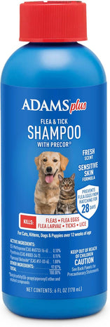 ADAMS Plus Flea & Tick Shampoo with Precor is a sensitive skin, lathering shampoo enriched with aloe, lanolin, coconut extract, and oatmeal to help condition the skin and coat, while removing loose dandruff, dirt and scales. Plus, it leaves your dog’s coat soft, shiny, and manageable. In addition, the lightly scented fragrance leaves your dog smelling pleasantly fresh. This shampoo kills adult fleas, ticks, and lice on contact. In addition to eliminating active infestations, the active ingredient Precor, an Insect Growth Regulator, controls flea infestation for up to 28 days. This shampoo works on dogs and puppies 12 weeks and older. With 5% of fleas living on your pet and the remaining 95% living in your home or yard, flea and tick control requires a multi-step product solution. ADAMS products are designed to provide you with the power to prevent pests on every front. Shop our entire line of Pet, Home, and Yard products to complete your dog and cat flea and tick control regimen.