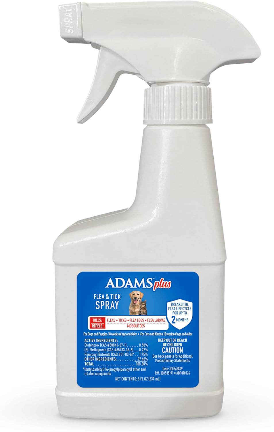 ADAMS Plus Flea & Tick Spray combines the adult flea killing power of Etofenprox with the long-lasting flea egg killing power of S-Methoprene, an Insect Growth Regulator. This highly effective combination of ingredients provides quick relief from biting fleas and continuous killing of flea eggs laid on your pet, breaking the flea life cycle. The elimination of both adult fleas and flea eggs is important because adult fleas live on your pet, causing discomfort and skin irritation, while the vast number of eggs that they lay fall off and develop in your house. Effective flea control requires treatment of your pets, house, and yard. ADAMS products are designed to provide you with the power to prevent pests on every front. Try ADAMS Flea & Tick Home Spray, specifically designed to use inside your home, and ADAMS Yard & Garden Spray, designed to use outside in your yard.