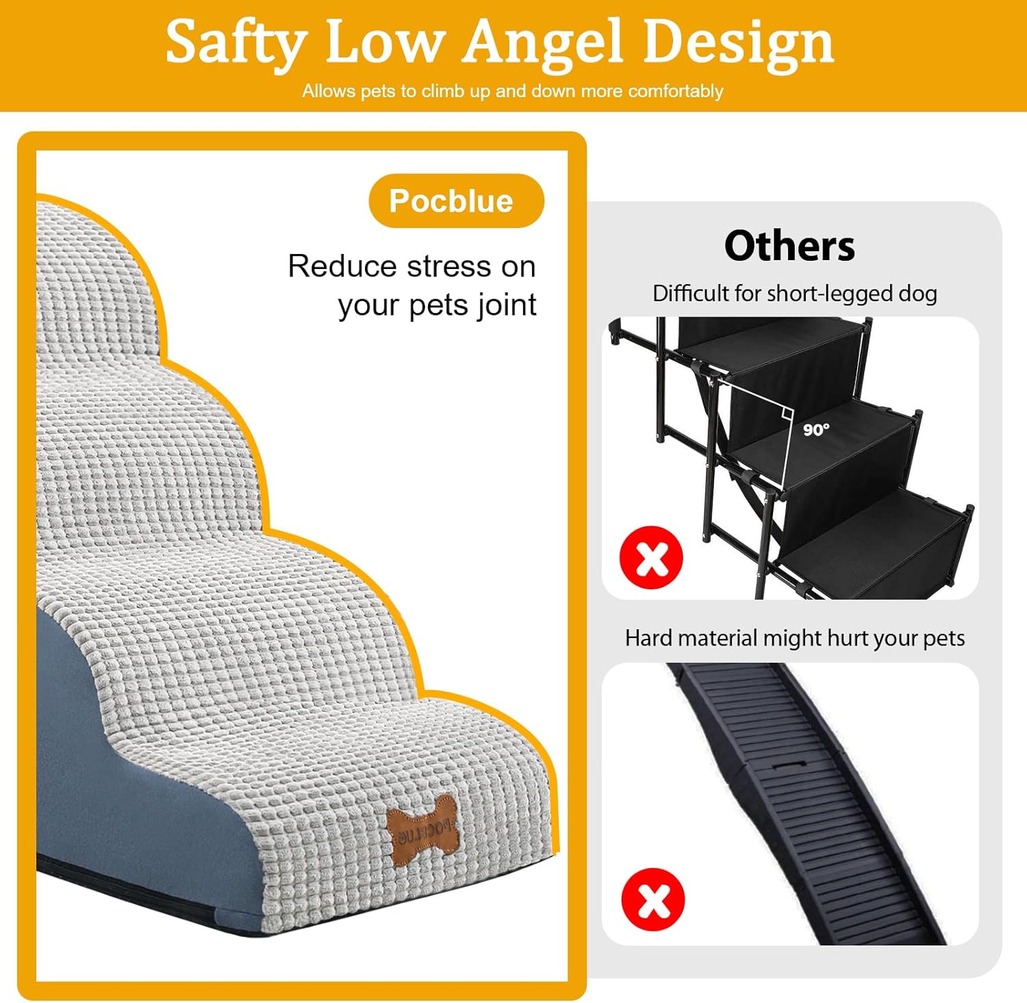 POCBLUE Stairs for pets, an easy way for your pup to get in and out of bed, is also helpful for our older fur friends and those with achy joints. Offers a safe and seamless solution for reaching their favorite spots, like beds or sofas, promoting injury-free mobility.