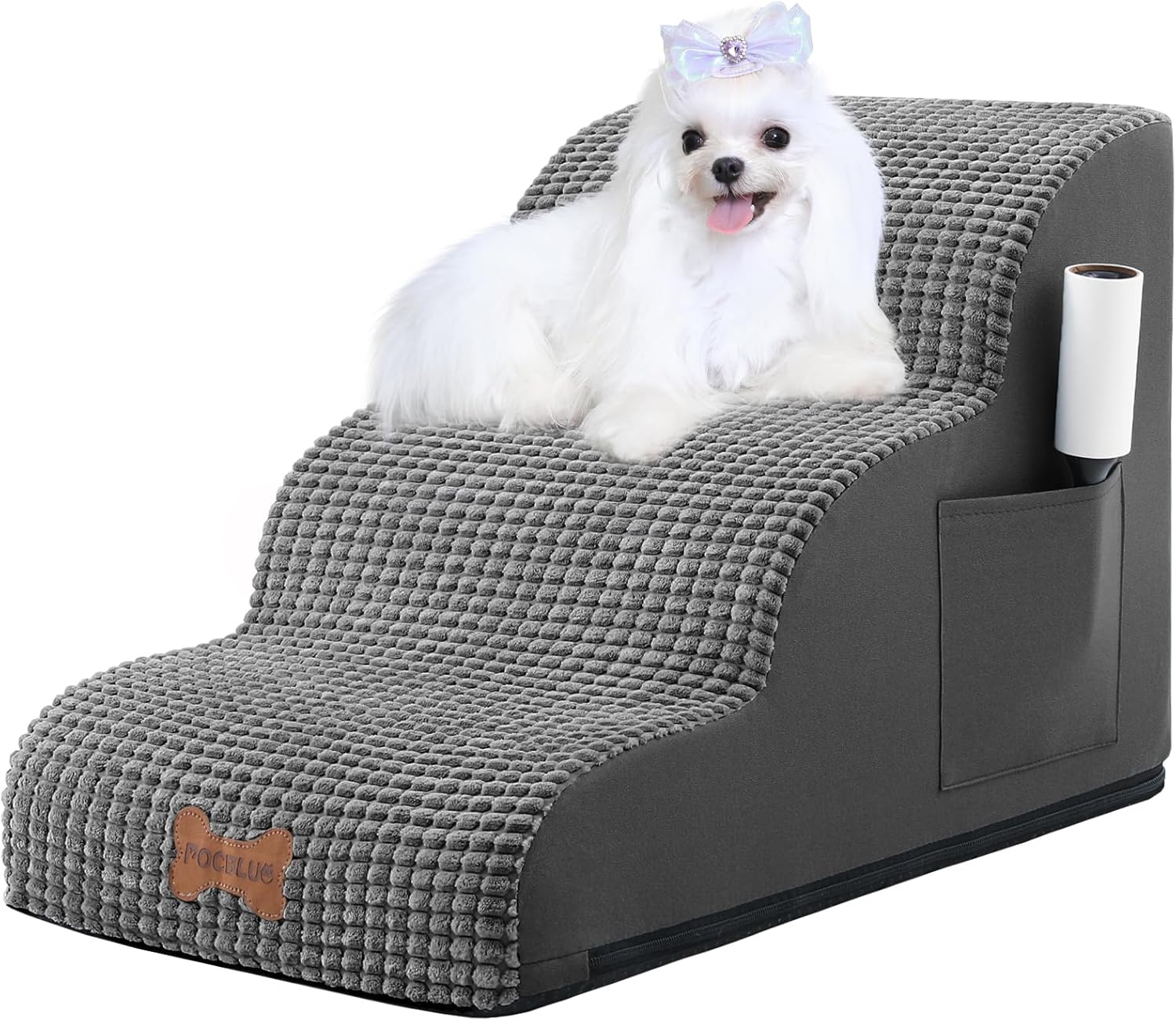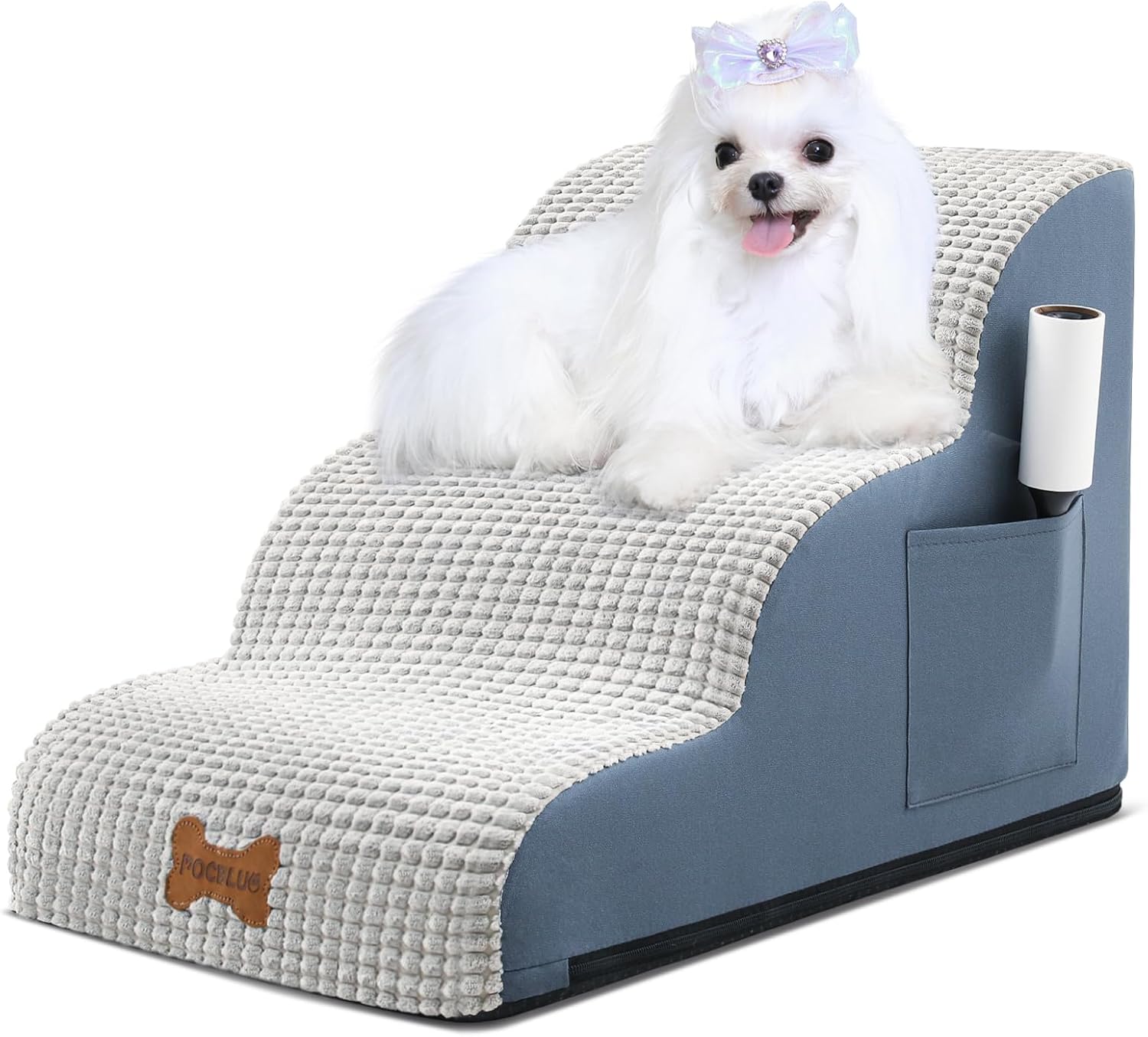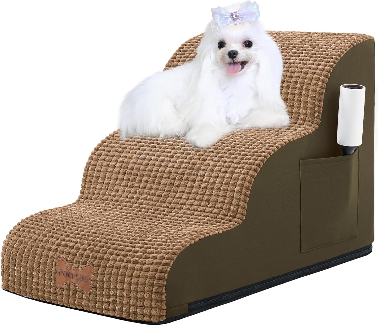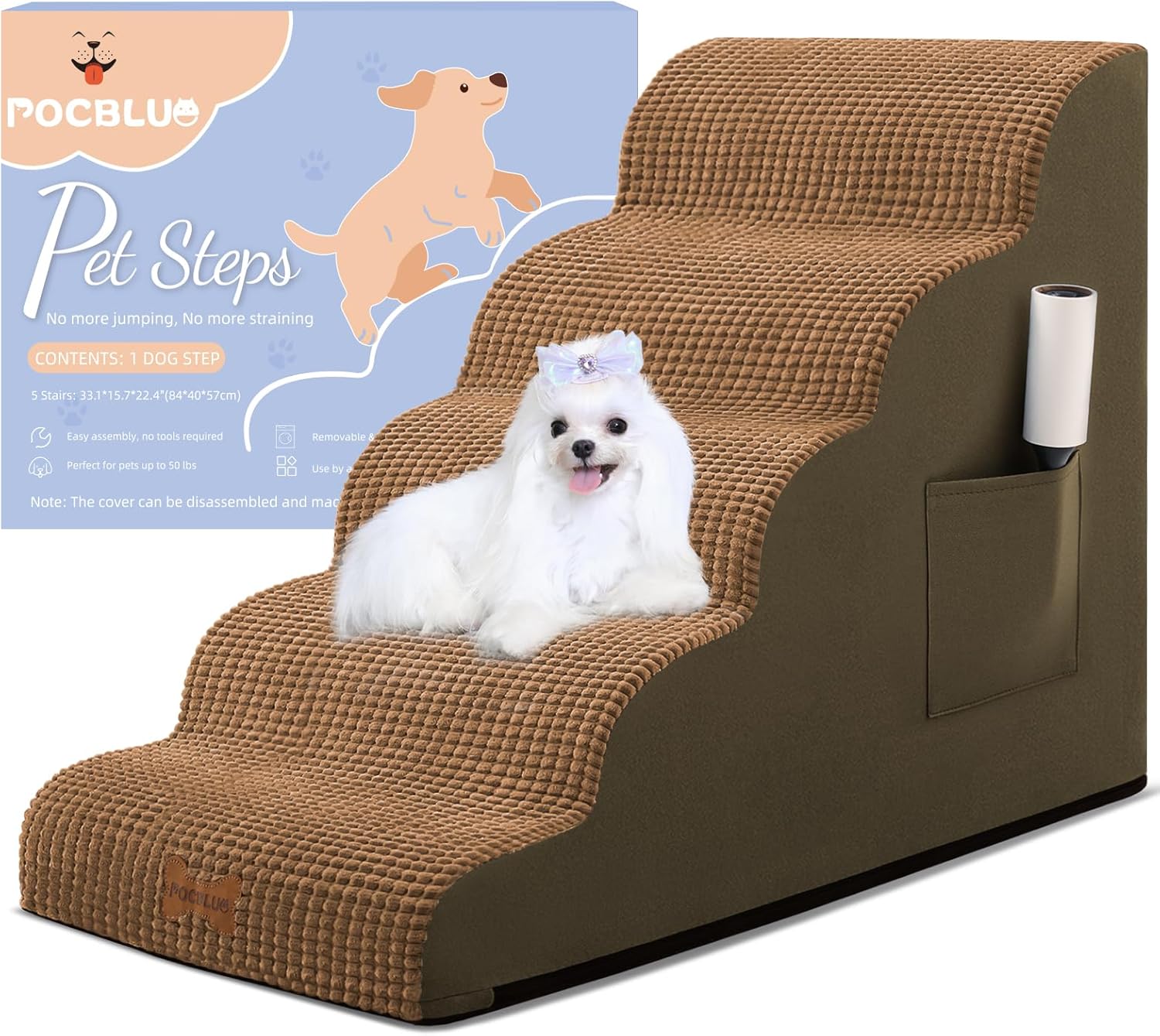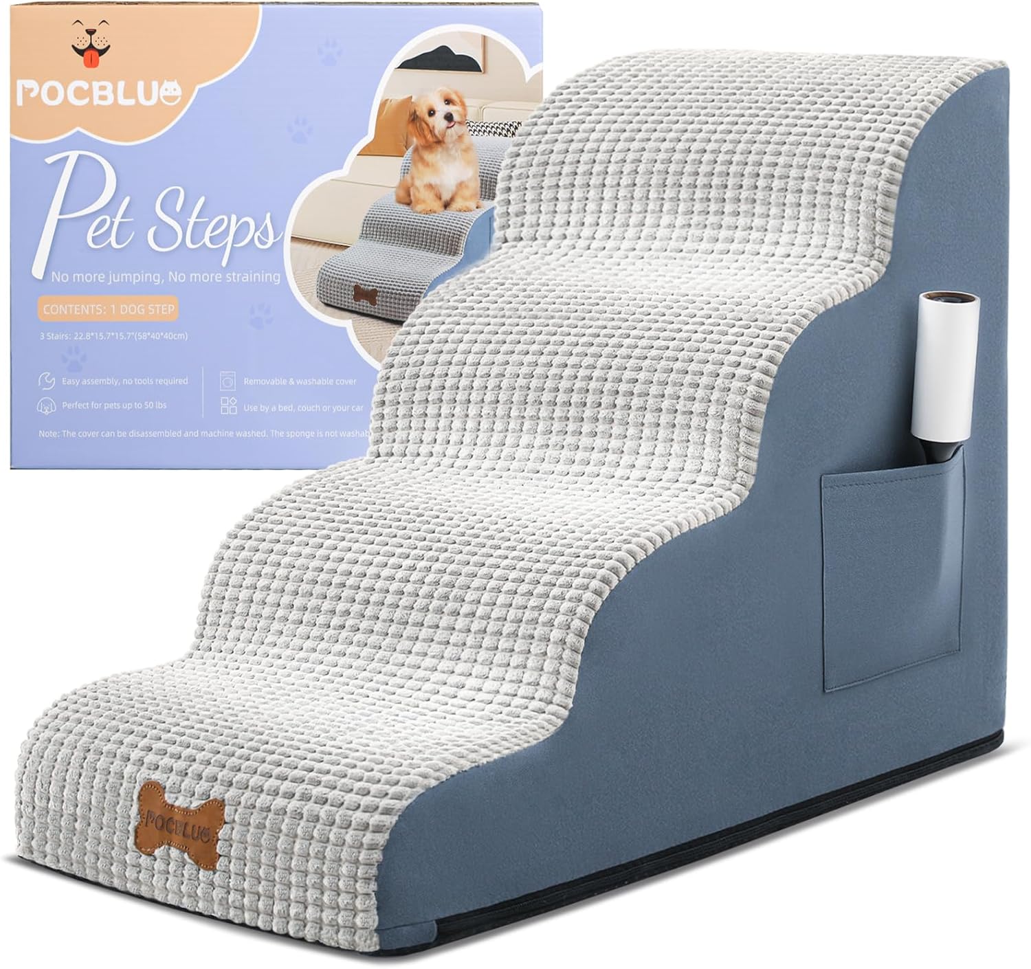 - EASY TO INSTALL AND CLEAN: POCBLUE dog stairs feature a removable, machine-washable coral fleece fabric cover with a waterproof backing to protect the sponge from water damage. For added convenience, the stairs are vacuum-sealed for compact packaging. Simply unpack, let the sponge fully expand within 48 hours, and your stairs will be ready for use—no assembly required!