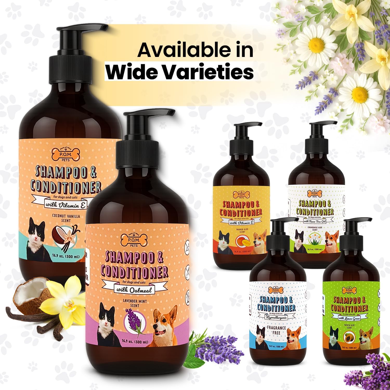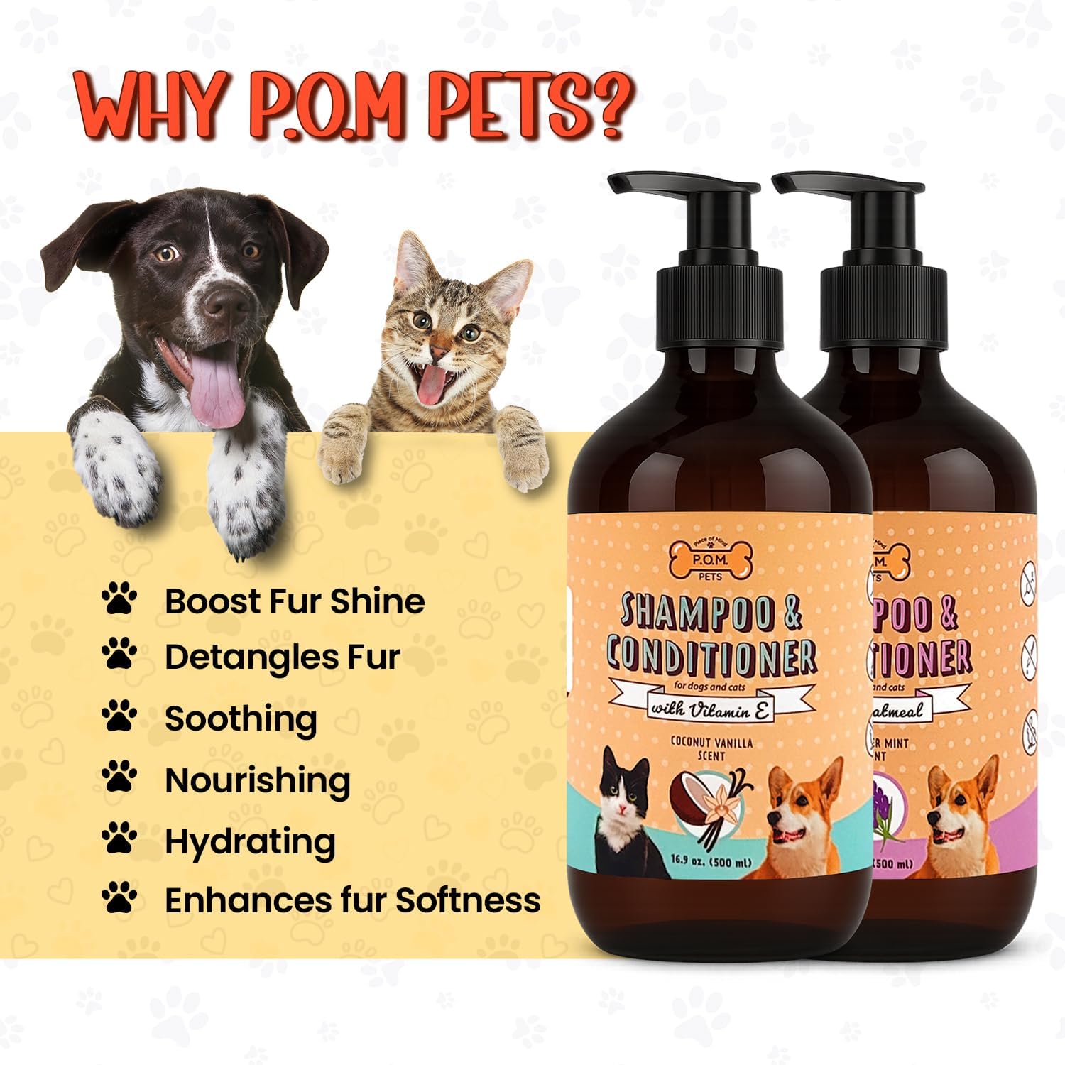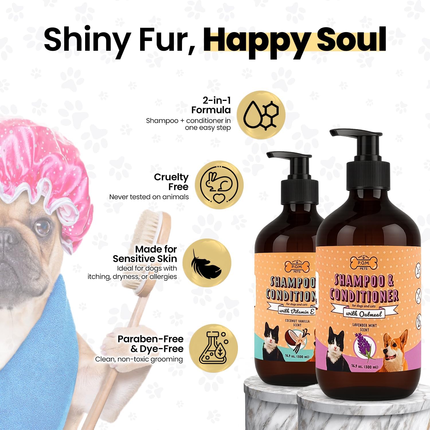 Pamper your pet with our carefully crafted luxurious dog shampoo and conditioner. This all-in-one grooming solution offers deep hydration, gentle cleansing, and noticeable shine perfect for pets with itchy skin relief needs or dry, sensitive coats. Our formula goes beyond basic cleaning by acting as a dog dandruff shampoo, dog shampoo and conditioner shedding control solution. Say goodbye to dryness and flakiness while welcoming a soft, healthy, and deodorized coat. With ingredients like Provitamin B5, Vitamin E, and a coconut-based cleanser, this dog bath soap alternative nourishes fur and maintains the skin’s natural balance. It's a must have for dogs prone to itchy paws, irritation, or discomfort. Whether you’re looking for a gentle dog wash, a natural dog shampoo and conditioner, or a full on dog spa experience at home, this product delivers. It’s perfect for homes with multiple pets, including those needing a doggie shampoo or Cats shampoo option. It's cruelty-free, hypoallergenic, and effective. Add our 2-in-1 shampoo to your routine and experience the benefits trusted by thousands of pet parents If you are searching for the best in dog shampoos & conditioner or cat shampoos & conditioner . Our P.O.M shampoo and conditioner for dogs and cats is your solution.