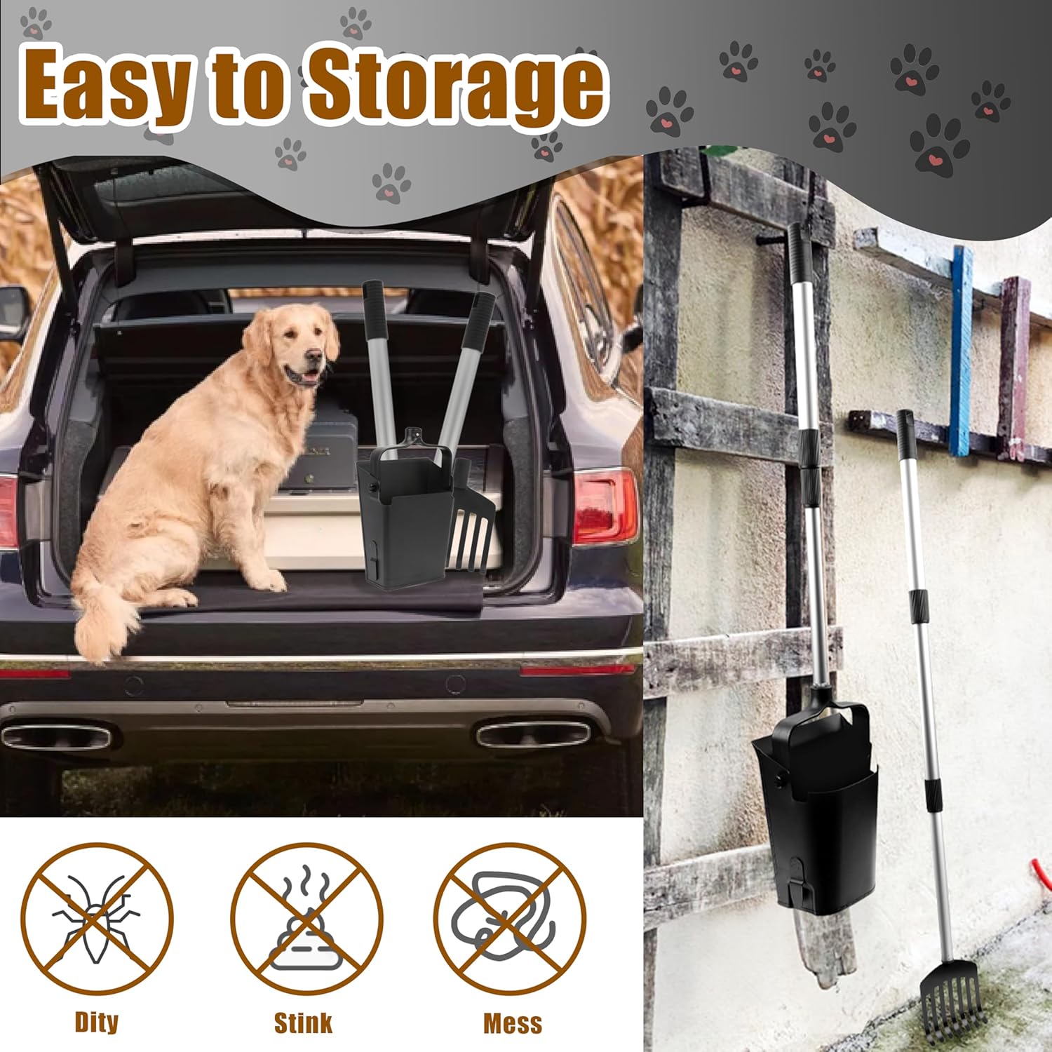 - 【Easy to Store & Clean】Our rake pooper scooper heavy dutyset easy to clean and there is no need to worry about rust. Just rinse with a hose, no manual cleaning required. The three-section telescopic handle saves space, and the clip-on interlocking design allows quick assembly and disassembly in one minute without any tools. At the same time, the bin and rake snap together for easy storage.