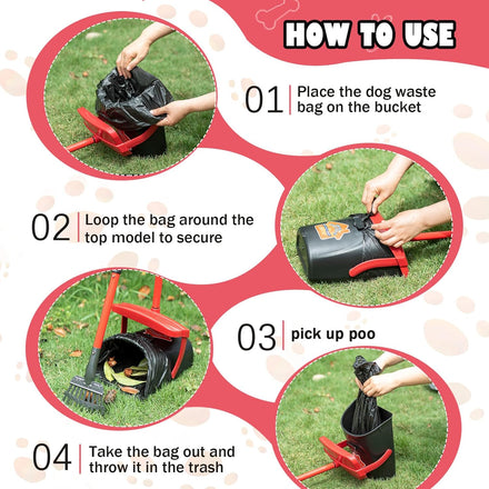 - How To Use Bags:①Place the dog waste bag on the bucket, loop the bag around the top model to secure, When finished scooping, unhook bag handles;②Inserting part of the bag into the scooper's frame side and close the scooper.Pulling the rest of the bag over the scooper and wrap one of its handle to the front side grip;If you encounter any problems during usecontact us as we are happy to help.