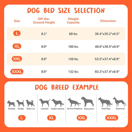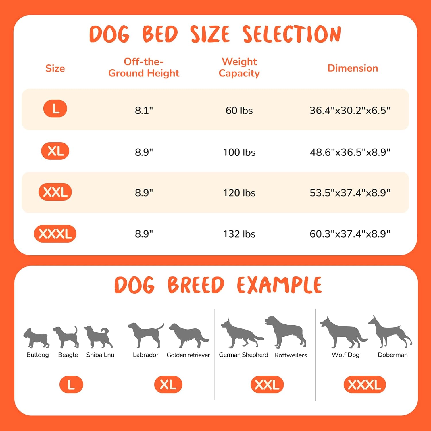 - Various Sizes Available: Small, medium, large, and even extra-large dogs can find their perfect fit! With sizes ranging from L to XXXL, plus non-slip foot pads and sturdy bottom struts, you don’t have to worry about this elevated pet bed tipping over—even by the poolside or during a rainy day
