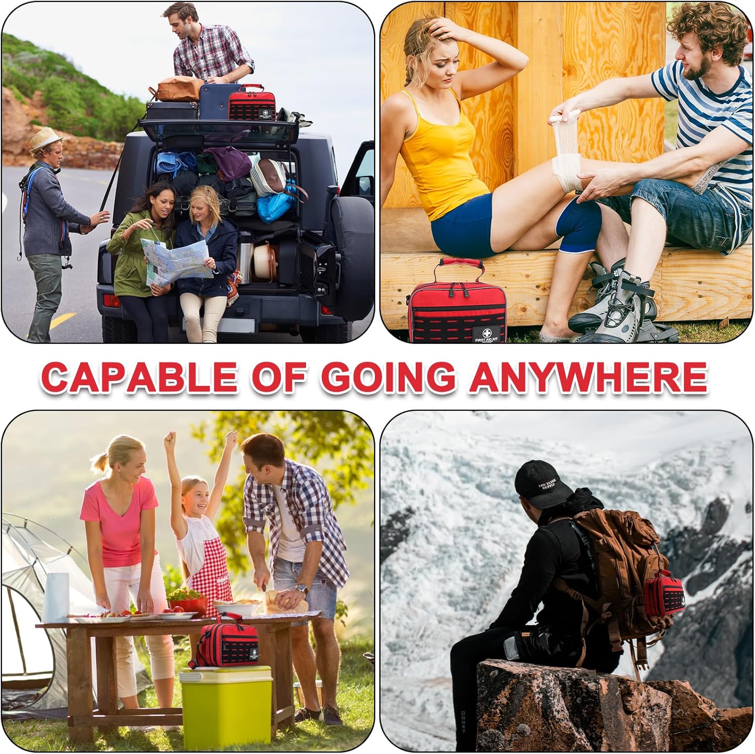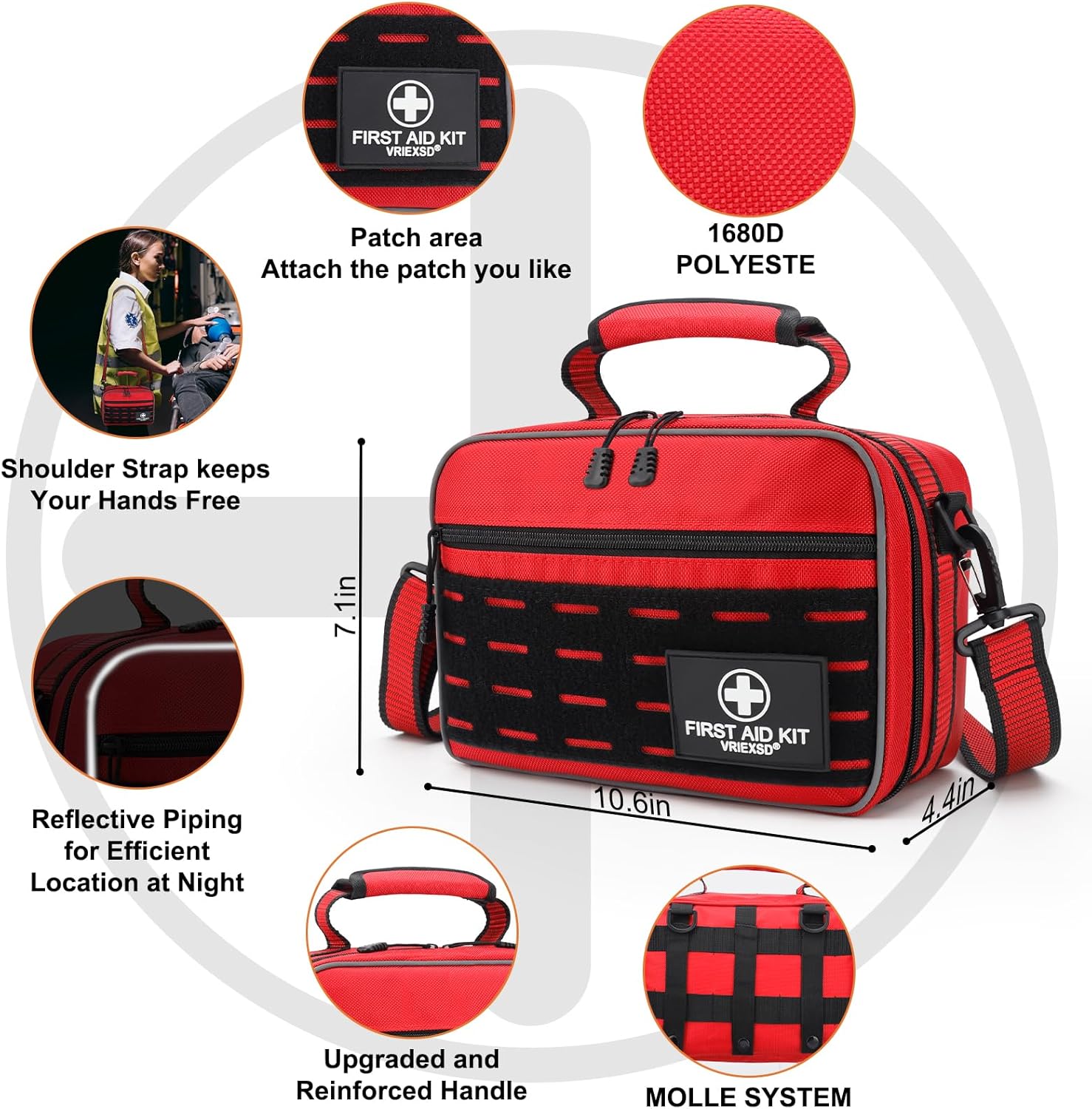 - WATERPROOF & DURABLE BAG - The first aid kit is made of 1680D polyester fiber that is tear-resistant and waterproof, and it also has a MOLLE system that can be used with shoulder straps and snap buckles. Also designed with handles on the top and sides, it can be mounted on cars, trucks, etc., making it convenient to carry. Equipped with reflective strips that reflect light in the dark, it is ideal for use as an emergency rescue item under adverse conditions