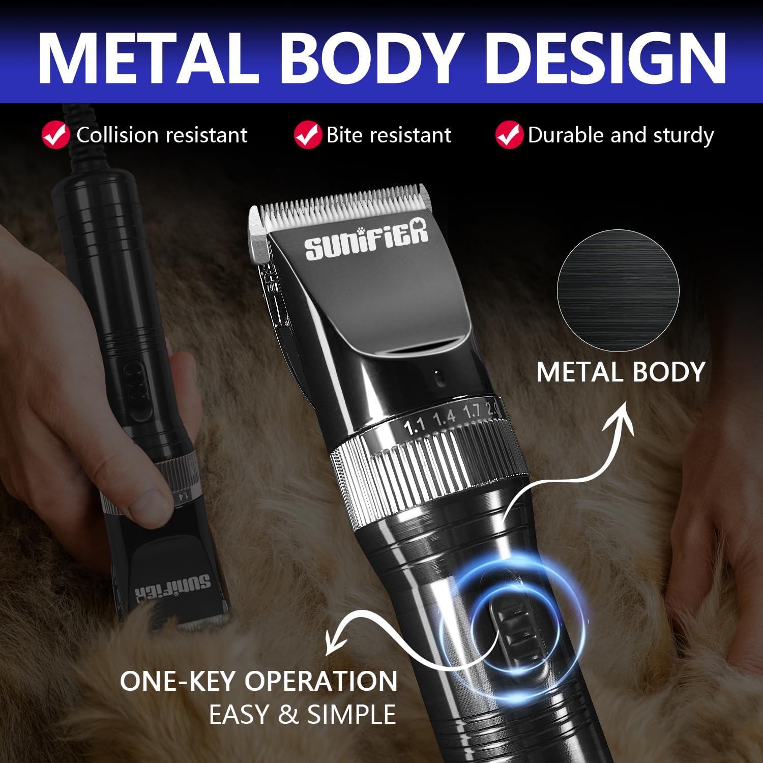 Dog Grooming Kit for Thick Coats: Our Professional Dog Clippers are specially crafted to tackle thick coats effortlessly. The sturdy Aluminum Alloy Body ensures durability and longevity, making these pet clippers your go-to grooming tool for years to come. Say goodbye to struggles and tangles, as these dog trimmers reduce the possibility of pulling hair, providing a smoother and faster grooming experience