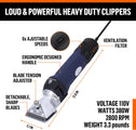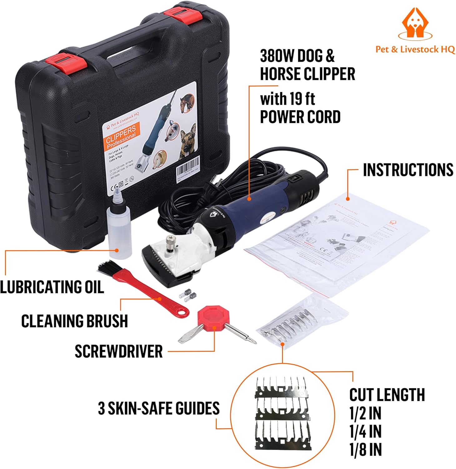 • Professional dog grooming large clippers: Heavy-duty dog clippers with a balanced 380W copper motor (2500RPM cutting speed) protected by an aluminum head and airflow vents to prevent overheating. These shears for grooming for thick coats are suitable for large dogs, horses, cattle, pigs, bovines. IMPORTANT: This pet hair trimmer is loud because of the 380W powerful motor
