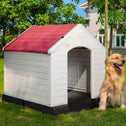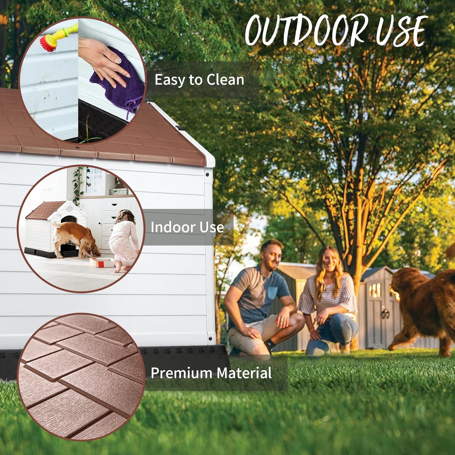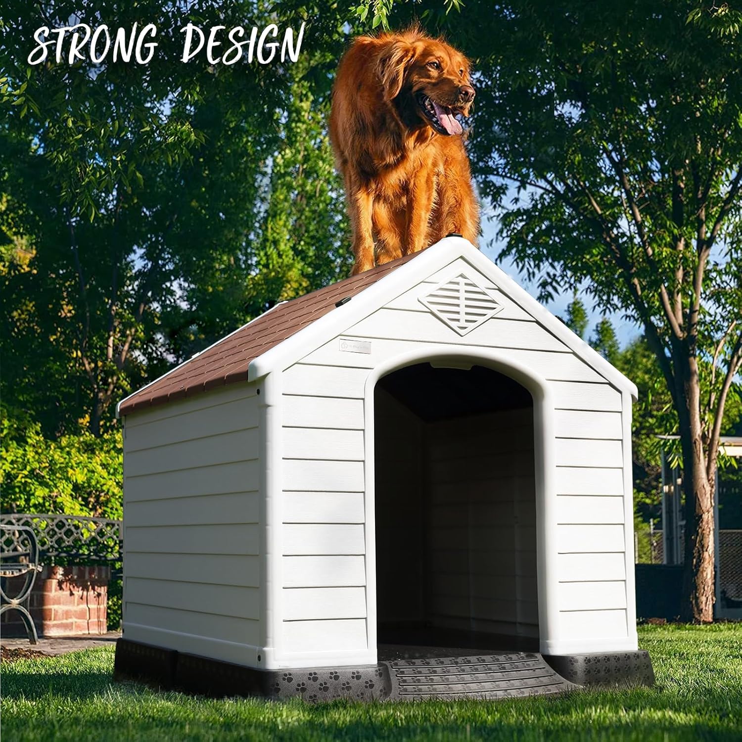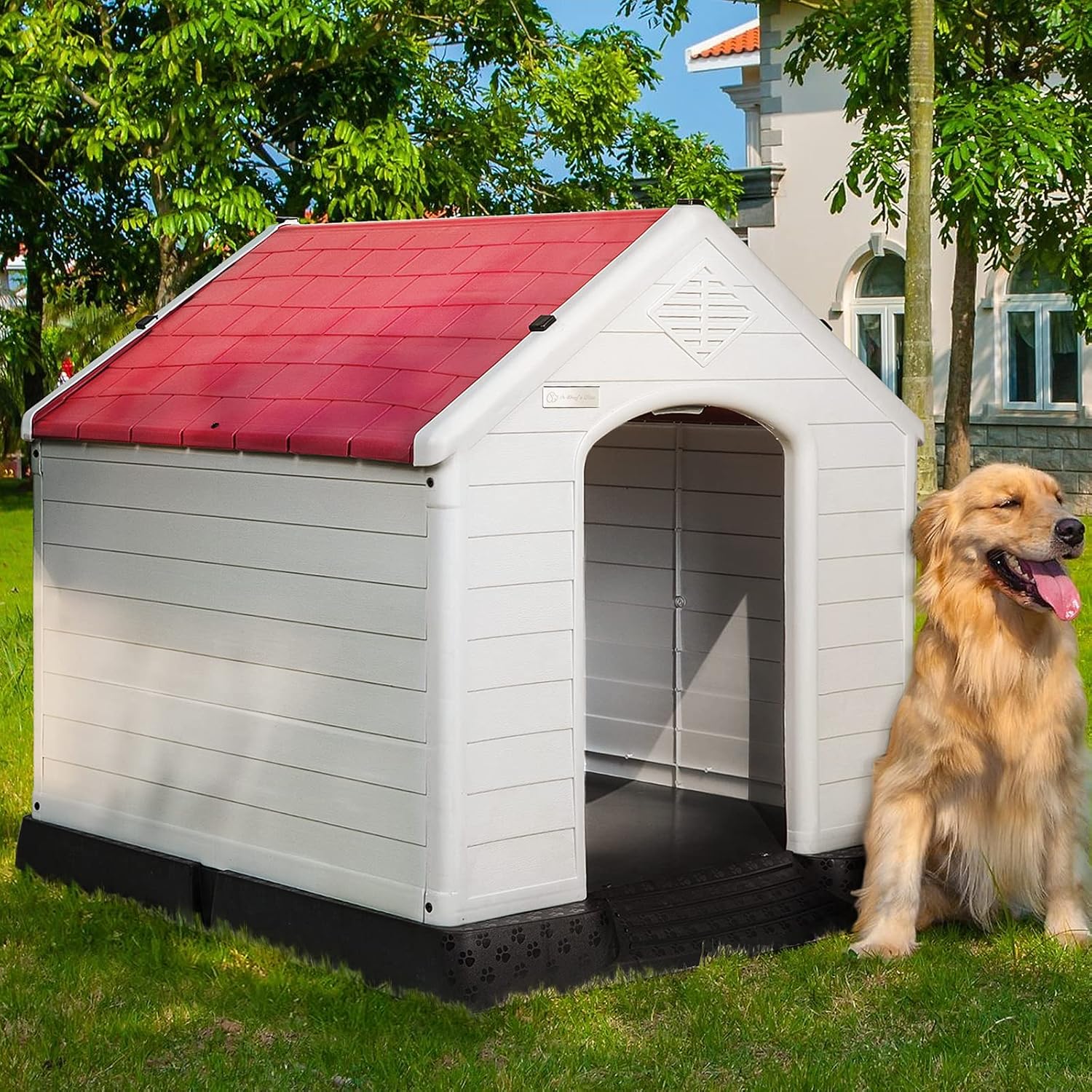 - Extra Large Space:The oversize of the dog house is 42 in(L)×38 in(W)×39 in(H). Entrance size is 24.5 in(H)×14.5 in(W). Internal dimensions is 37 in×41 in×38 in. The space in the dog house is suitable for dogs up to 100 pounds. This plastic dog house is ideal for backyard, patio, deck, etc.