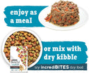 Make your little dog happy with Purina Beneful IncrediBites With Real Beef, Tomatoes, Carrots and Wild Rice adult wet dog food for small dogs. We craft this recipe using real beef and real vegetables and grains you can see, helping create a great-tasting meal made with no artificial colors, flavors or preservatives. Formulated for small breed dogs just like yours, this protein-rich recipe helps support strong muscles and his whole-body health to keep him ready to go whenever you are. Since this recipe is 100 percent complete and balanced for adult dogs and contains 23 essential vitamins and minerals, you can rest easy knowing that you're giving your best friend something that's good for him. Serve IncrediBites wet dog food for small breeds as a meal, or mix our recipes with his favorite dry dog food to keep him entertained with a variety of textures and Purina dog food flavors.