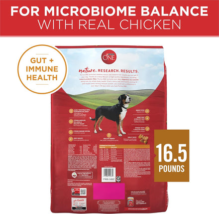 - Purina ONE chicken and rice dog food offers a microbiome balance and a SmartBlend of high-quality ingredients, including prebiotic fiber for dogs, to help your pal live up to his full potential