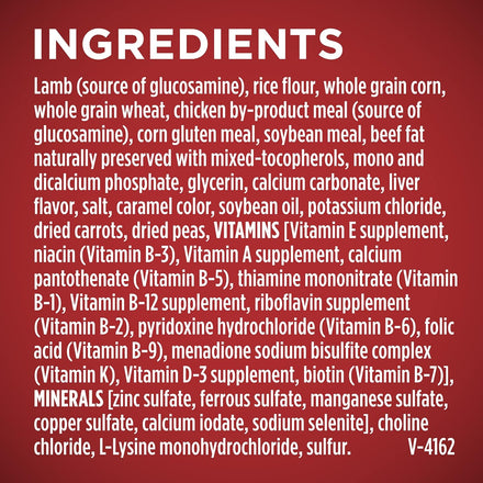 Make a great choice for your canine with Purina ONE Natural Lamb and Rice Formula With Added Vitamins, Minerals and Nutrients dry dog food. What are the ingredients in Purina ONE? This natural dog food features a SmartBlend of high-quality Purina ONE dog food ingredients, including the added vitamins, minerals and nutrients adult dogs need for complete and balanced nutrition. Real lamb is the first ingredient in this adult dog food with rice, helping deliver protein for dogs that helps maintain strong muscles. Plus, with prebiotic fiber for dogs, this high protein dry dog food for skin and coat care is highly digestible and formulated to support a microbiome balance. Crunchy dog food kibble and added calcium supports his strong teeth, too. Pick up that familiar red bag to see the differences this Purina ONE lamb and rice dog food can make, and check out the bag for the full Purina ONE feeding chart, calories per serving, dog food ingredients list and instructions on changing dog food.