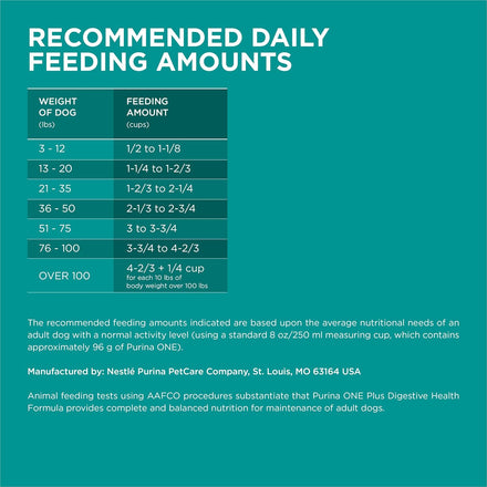 Fill your dog's bowl with Purina ONE +Plus Natural Digestive Health Chicken and Rice Formula with added vitamins, minerals and nutrients adult dry dog food. Real chicken is the first ingredient, and the protein-rich morsels support his muscles, including a healthy heart. Purina ONE sensitive stomach dog food is highly digestible and contains a SmartBlend of high-quality ingredients enriched with probiotics to support digestive wellness. We make our digestive care dog food with omega-6 fatty acids to nourish his skin and coat, and a blend of four antioxidants, including vitamins E and A, plus the minerals zinc and selenium help support immune health. Your dog is getting a Purina dog food with no artificial flavors or preservatives and no fillers. Plus, the great-tasting kibble has calcium to support your dog's strong teeth and healthy gums. Ensure your dog gets 100 percent complete and balanced nutrition crafted by a veterinarian-recommended brand with this tasty dog dry food.
