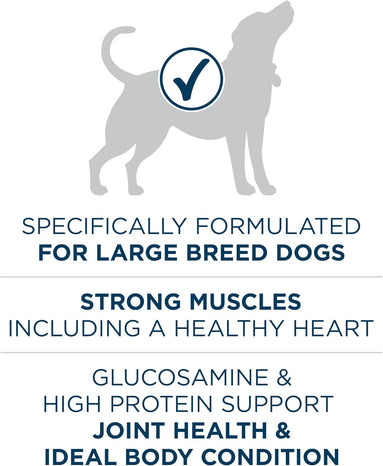 Promote your large breed dog's whole body health and give him 100 percent complete and balanced nutrition for adult dogs with Purina ONE +Plus Natural Large Breed Formula With Added Vitamins, Minerals and Nutrients adult dry dog food. Featuring meaty morsels and crunchy kibble dogs love, this delicious dry dog food recipes starts with real chicken as its first ingredient and provides a high level of protein that helps support strong muscles and a healthy heart. Plus, this natural dog food with glucosamine is made by a veterinarian-recommended brand and formulated to help maintain an ideal body condition and joint health for dogs. Because this large breed chicken dog food recipe is made with no artificial flavors or preservatives and zero fillers, you can be confident that every high-quality ingredient has a purpose. We include four antioxidant sources in our adult large breed dog food for a strong immune system, and calcium along with the crunchy kibble supports strong teeth and healthy gums.