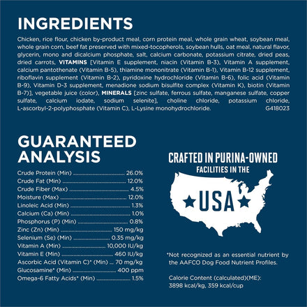 - High Protein dog food crafted in Purina-owned, U.S. facilities provides 100 percent nutrition for adult dogs