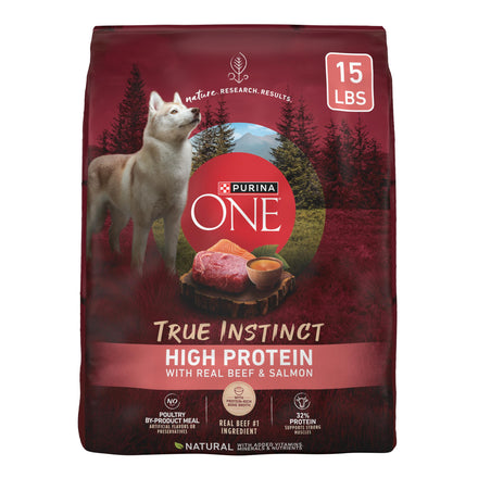 Give your dog the taste he craves with Purina ONE True Instinct With a Blend Of Real Turkey and Venison adult natural dry dog food with added vitamins, minerals and nutrients. With 100 percent nutrition and 0 percent fillers, every ingredient in this Purina dog food has a purpose. We start our high protein dog food recipe with real turkey as the number 1 ingredient and include real venison. They help to deliver 30 percent protein, which helps support your active dog's strong muscles. We also craft our high quality dog food with added vitamins, minerals and nutrients and with no poultry by-product meal or artificial flavors or preservatives. This recipe also features natural sources of glucosamine to support joint health for dogs. A crunchy kibble texture and added calcium helps support his strong teeth and healthy gums. With natural nutrition backed by research and crafted by a veterinarian-recommended brand, Purina ONE True Instinct With Real Turkey and Venison dog food keeps you and your dog happy.