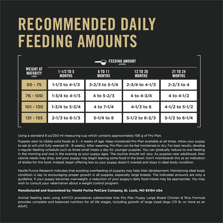 Product Description Provide your large breed puppy with a great start in life by serving him the wholesome nutrition in Purina Pro Plan Brand Dog Food Puppy Large Breed Chicken and Rice Formula dry puppy food. High-quality protein, including chicken as the number1 ingredient, delivers the building blocks he needs to maintain his active lifestyle, and the nutrient-rich formula is designed for puppies weighing over 50 pounds at maturity. Every high-quality ingredient in this super-premium dry puppy food is carefully chosen for a specific nutritional or functional purpose. DHA from fish oil nourishes his brain and vision development, while vitamin A and omega-6 fatty acids support his healthy skin and coat. Crunchy kibble and a delicious flavor tempt your curious canine to his bowl at mealtime, while antioxidants support his developing immune system. Make this large breed dry puppy food part of your puppy's complete and balanced diet, and show him you care about his overall health and happiness. From the Manufacturer Large or small, young or old, within every dog lies an extraordinary spirit. Purina(R) Pro Plan(R) offers specialized nutrition for an exceptional life, experienced the way your dog was meant to live it.