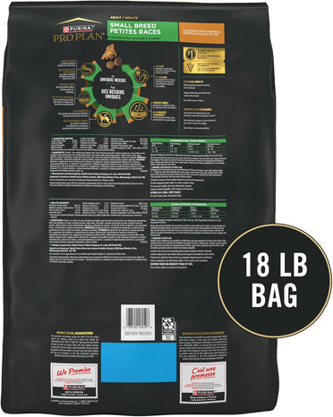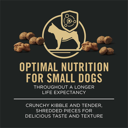 Take care of the nutritional needs of your small breed dog by feeding him Purina Pro Plan Brand Dog Food Small Breed Shredded Blend Chicken and Rice Formula adult dry dog food. With real chicken as the first ingredient, this super-premium small breed dog food delivers outstanding nutrition and flavor. He'll love the textural contrast of tender shredded pieces mixed with crunchy kibble in a size that is made for his smaller mouth and teeth. A high level of protein helps your best friend maintain an ideal body condition, while vitamin A and linoleic acid, an omega-6 acid, aid in maintaining a healthy skin and coat. Natural prebiotic fiber, sourced from wheat bran, provides digestive support, and guaranteed live probiotics promote digestive and immune health. With the taste and texture dogs love, Purina Pro Plan Brand Dog Food Small Breed Shredded Chicken and Rice Formula provides a 100 percent complete and balanced meal for your adult dog under 20 pounds.