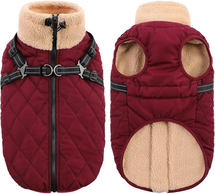 Queenmore Dog Coat, Dog Coats for Small Dogs, Doggy Winter Jacket with Zipper On Back, Waterproof Pet Jacket with Harness Built in, Pet Puffer Coat for Bichon, Schnauzer, Yorkie, Burgundy S