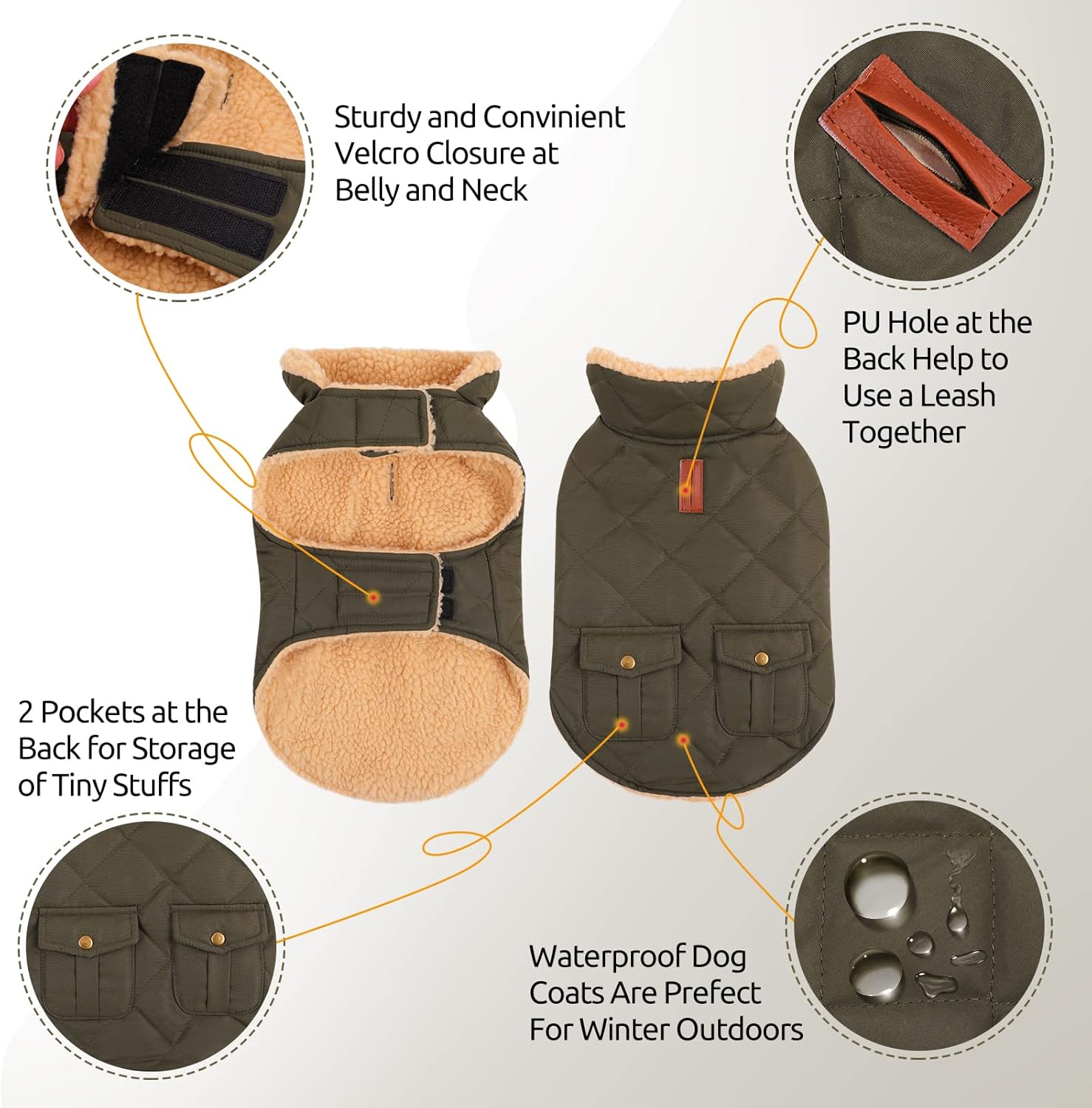 CUTE STORAGE POCKETS AT THE BACK - The stylish quilting pockets at the back are eye-catching. It is easy to store some snacks, garbage bag or the leash to the storage pockets at the back of the dog jacket.