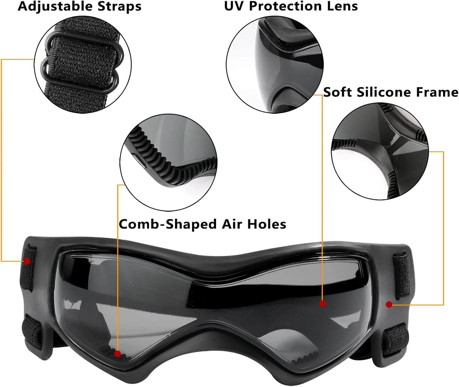 - Comfortable Material: The doggles goggles with soft frame and comb-shape vents, make goggles fits comfortably, also there won't be water mist on the lens. The UV protection lens can help us and our pet enjoy the sunshine better.Comfortable Material: The doggles goggles with soft frame and comb-shape vents, make goggles fits comfortably, also there won't be water mist on the lens. The UV protection lens can help us and our pet enjoy the sunshine better.