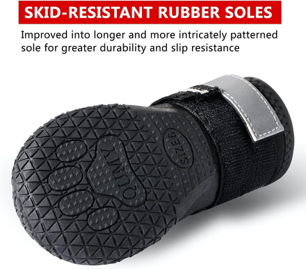 SECURE and ADJUSTABLE: Easy to put on / off. These dog shoes expands with a wide split seam opening and two adjustable and reflective straps to ensure a tight fit, also make your dog safe at night