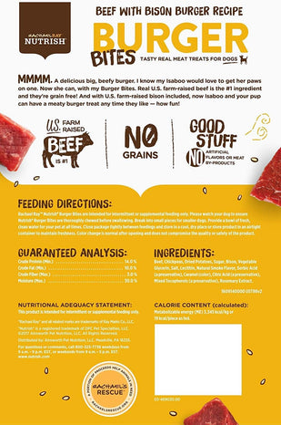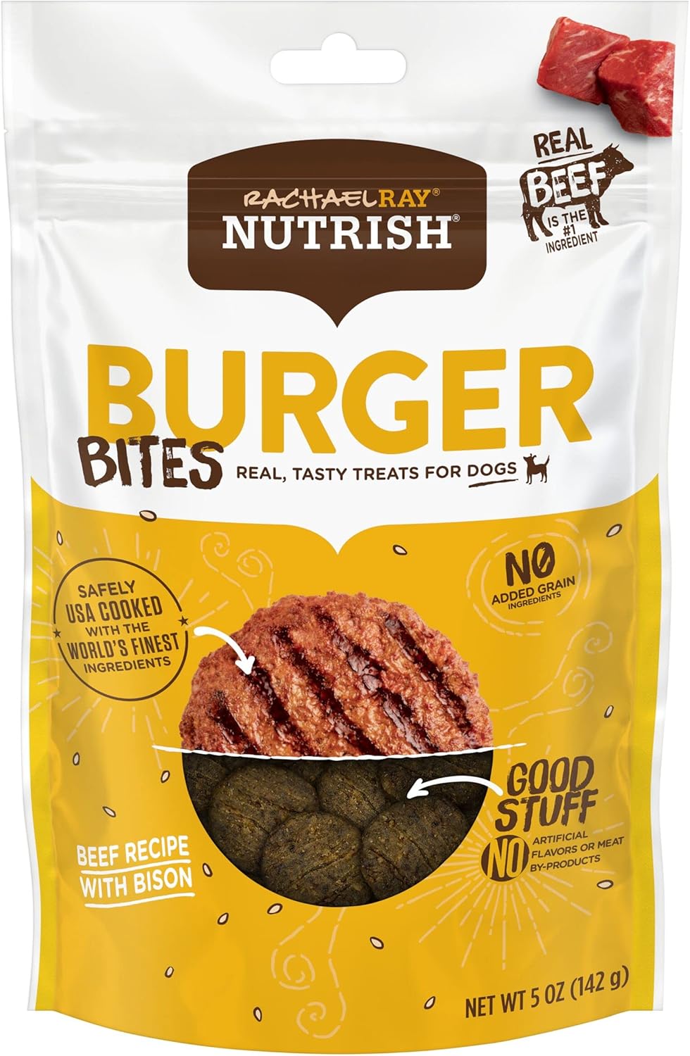 Product Description Any dog would love to get their paws on a big, juicy burger fresh off the grill. Give them the mouthwatering flavor they crave with Rachael Ray Nutrish Burger Bites Beef Recipe With Bison dog treats. These soft dog treats break apart easily for smaller mouths, making them perfect for dogs of all sizes. Every batch is safely USA cooked with the world’s finest ingredients. The number one ingredient? Real beef. There are no artificial flavors or meat by-products here—no added grain ingredients, either. Just good stuff that gets your dog drooling whenever you open the pouch. Give ‘em a try. Manufacturer Contact Information Post Consumer Brands, 20802 Kensington Blvd, Lakeville, MN 55044