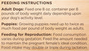 Directions | Feed your adult dog 1/2 to 1-1/4 cups per 3 to 12 pounds of body weight per day; 1-1/4 to 2 cups per 12 to 25 pounds of body weight per day; 2 to 3-1/2 cups per 25 to 50 pounds of body weight per day; 3-1/2 to 5-3/4 cups per 50 to 100 pounds of body weight per day; 5-3/4 plus 1/2 cup for every additional 12 pounds for over 100 pounds of body weight per day. Amounts are based on a standard 8 oz. dry measuring cup. This chart represents average recommended daily portions. You may need to feed slightly more or less, depending on your dog's activity level and overall fitness. Be sure to provide plenty of fresh, clean water daily. Close package tightly between feedings or store product in an airtight container to maintain freshness. Adult Dogs: adult dogs with normal activity may be fed once daily. Depending on your dog's age and activity, serving sizes may vary slightly from the recommended daily feeding guide portions. Talk to your veterinarian about your dog's ideal weight and adjust your amounts accordingly. |
