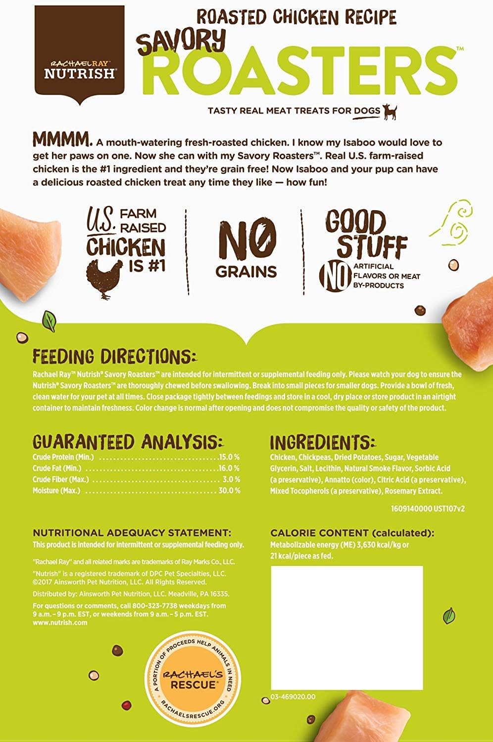 Product Description Mmmm. A mouth-watering fresh-roasted chicken! I know any pup would love to get their paws on some. Now they can with my Nutrish Savory Roasters real meat dog treats. Real U.S. farm-raised chicken is the #1 ingredient in this tasty grain free recipe. Now your pup can have a delicious roasted chicken treat any time they like — how fun. Manufacturer Contact Information Post Consumer Brands, 20802 Kensington Blvd, Lakeville, MN 55044